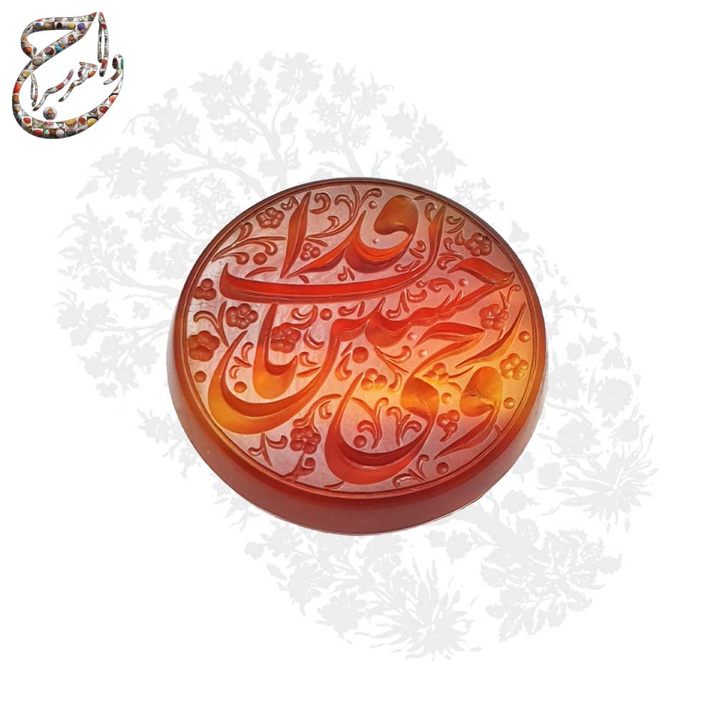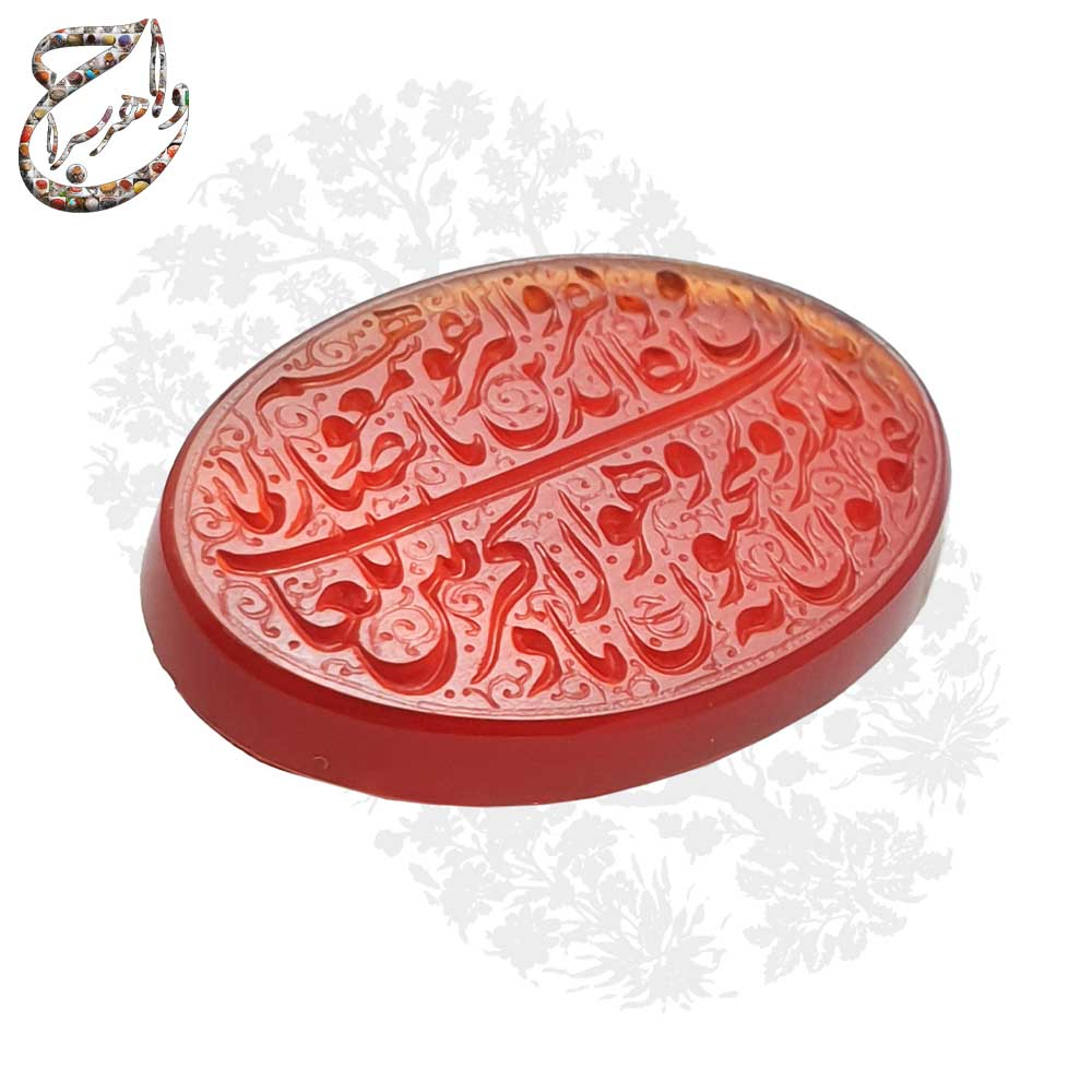 زمینهی نگین با ظرافت بالا و دقت تمام تراش خورده و خطوط حکاکی بهصورت برجسته و خوانا اجرا شدهاند. رنگ قرمز طبیعی این عقیق در نور، درخششی گرم و زنده دارد و به آن جلوهای روحانی و اصیل میبخشد.