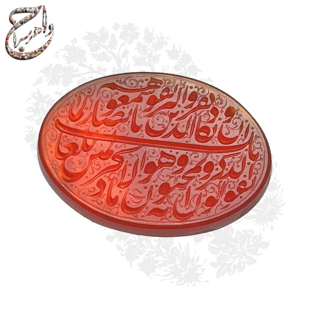 این اثر فاخر از جنس عقیق سرخ خراسانی اصل است که با رنگ قرمز طبیعی و جلای درخشان خود جلوهای بسیار چشمنواز دارد. بر روی این سنگ، آیهی شریفهی «وَإِن يَكَادُ الَّذِينَ كَفَرُوا…» با حکاکی دستی و خط امضای استاد حکاک نقش بسته است؛ آیهای که طبق آموزه های اسلامی برای دفع چشمزخم و حفاظت معنوی مورد توجه قرار گرفته است.