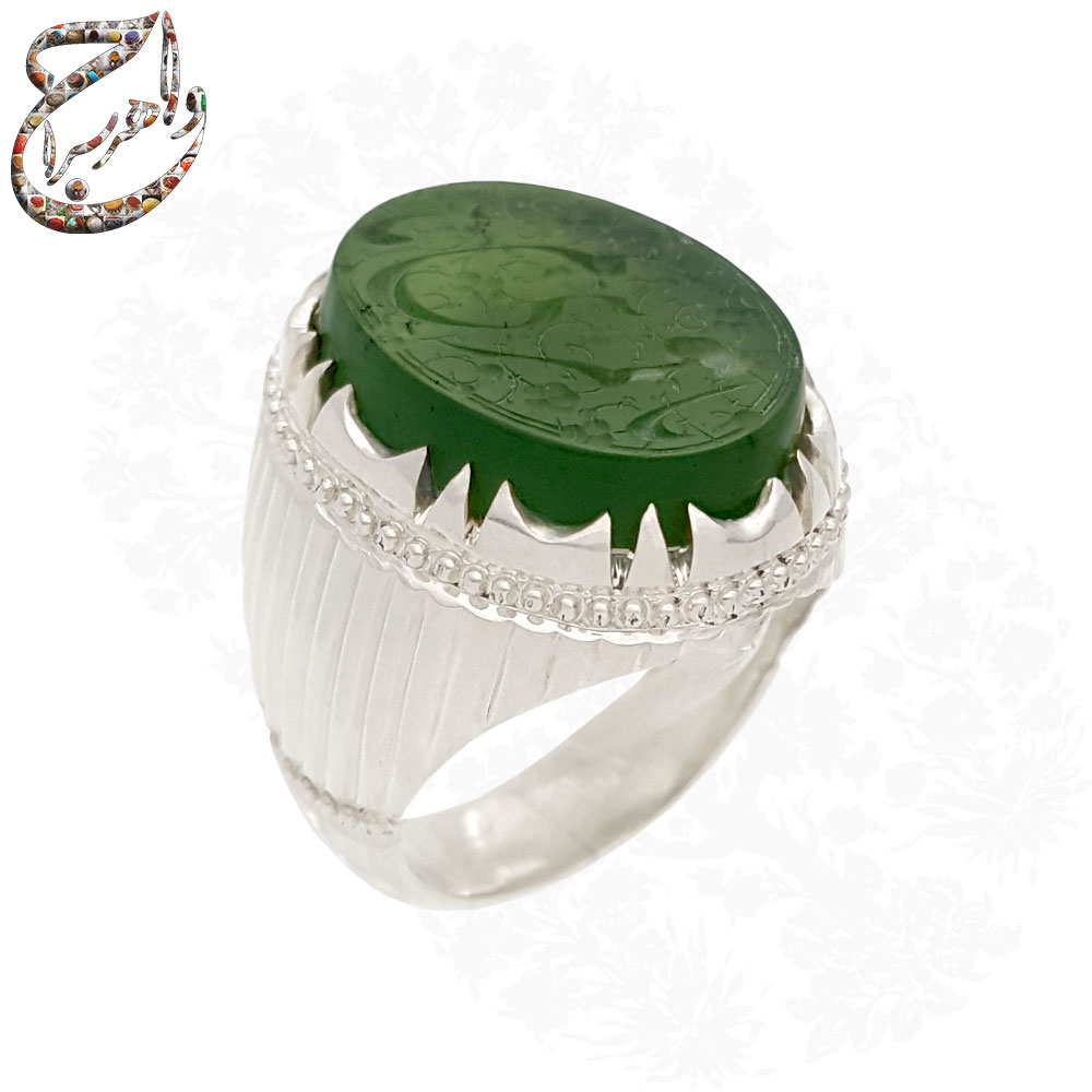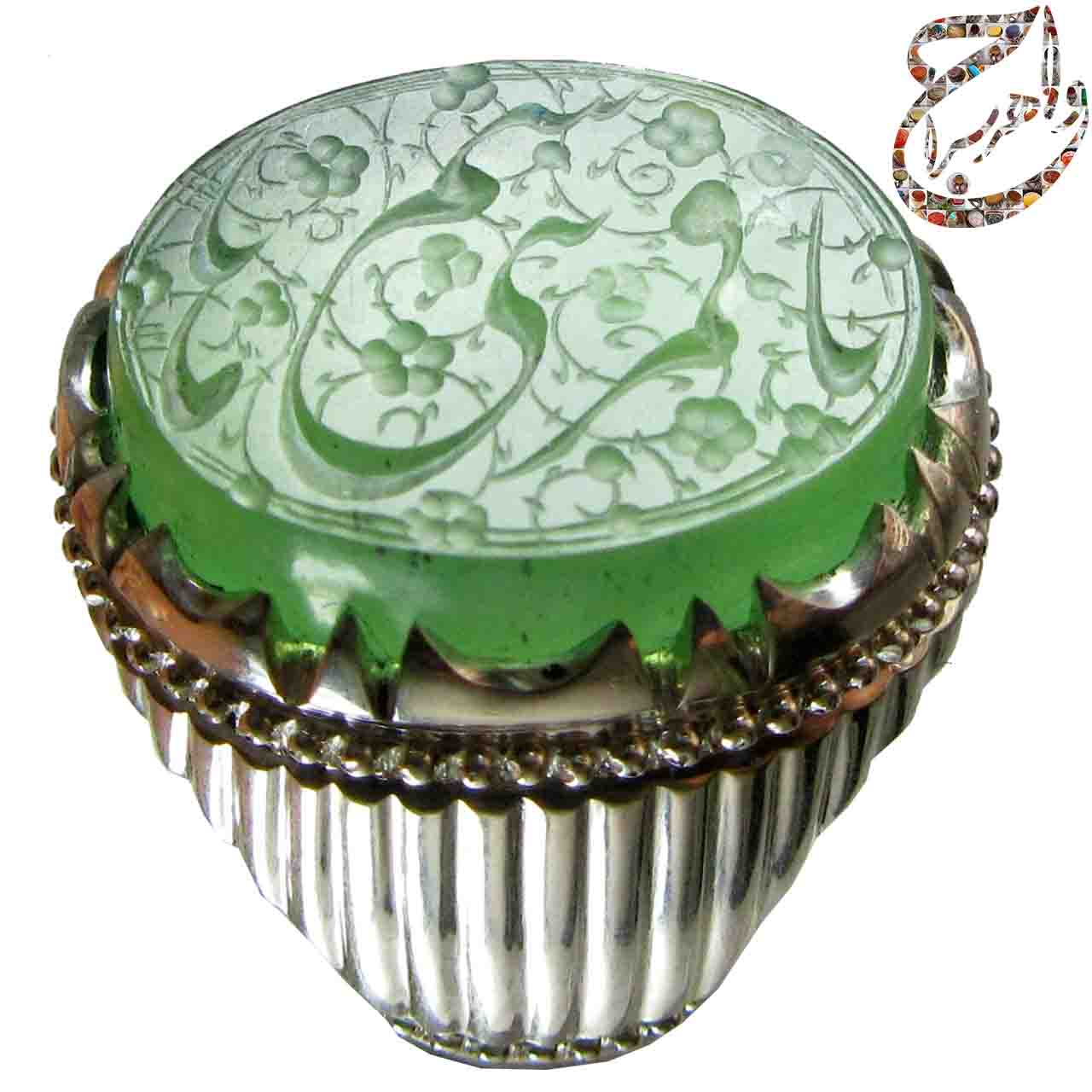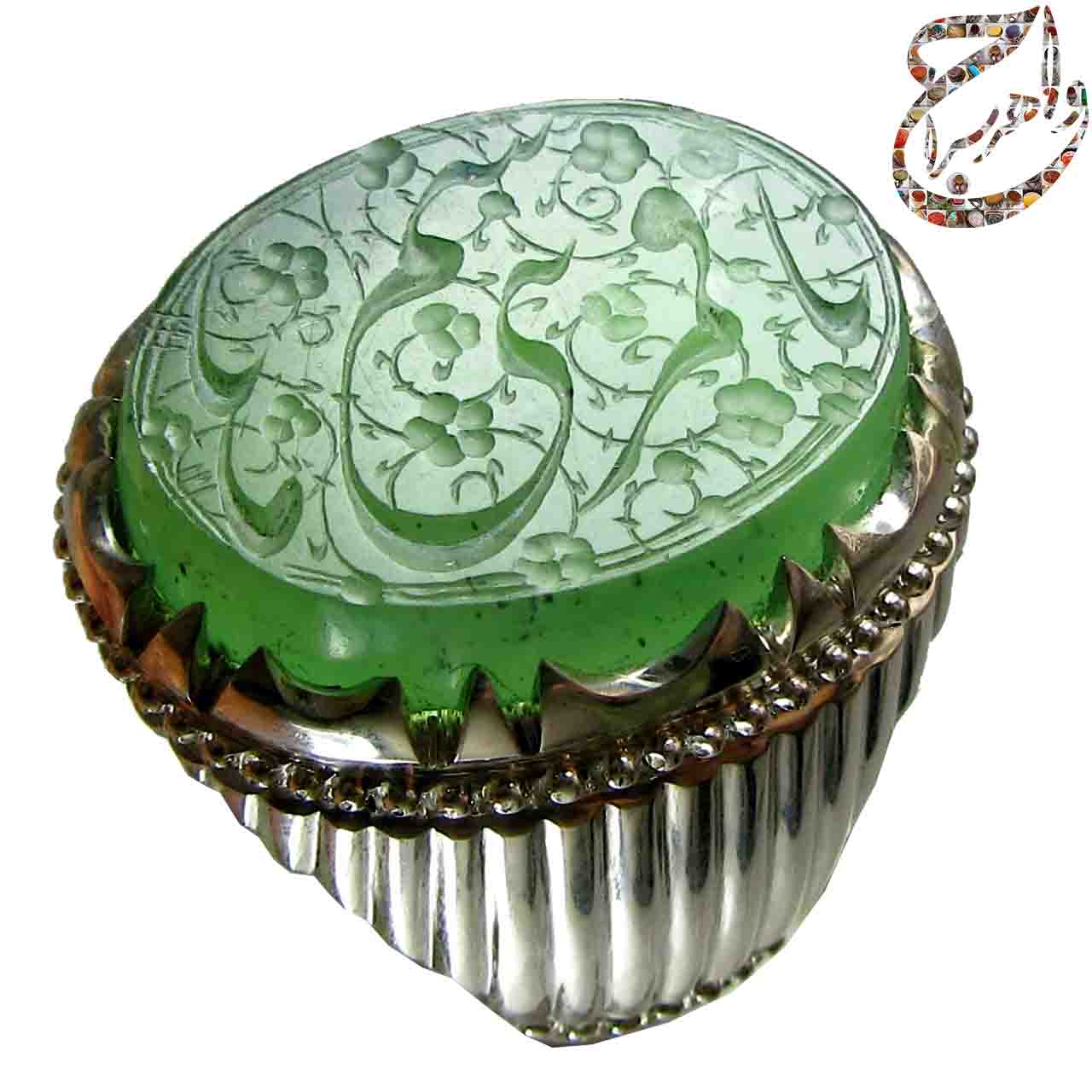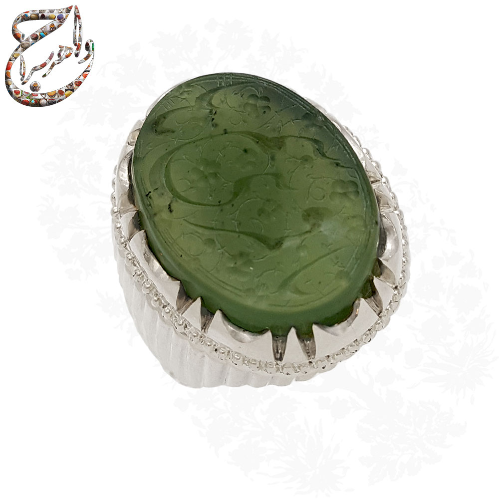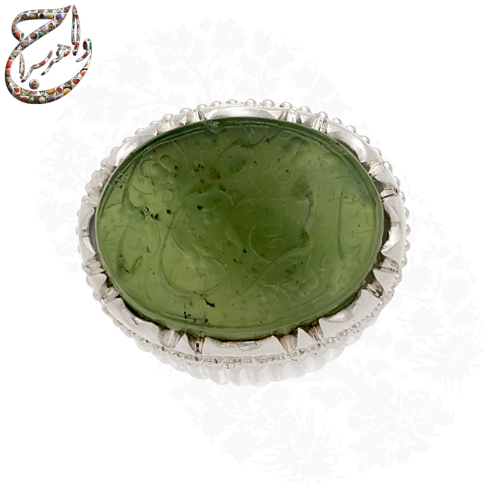 انگشتر یشم ذغالدار یمنی اصیل حکاکی شده توسط استاد مدنی با امضاء مزین به ذکر زیبای یا قمر بنی هاشم ع . رکاب انگشتر از جنس نقره دست ساز به شیوه ی خاک ماسه توسط استاد محمد افتخاری با امضاء تهران افتخاری در قسمت داخلی رکاب ساخته شده است .