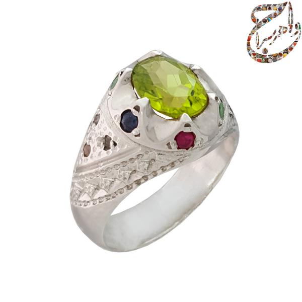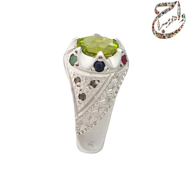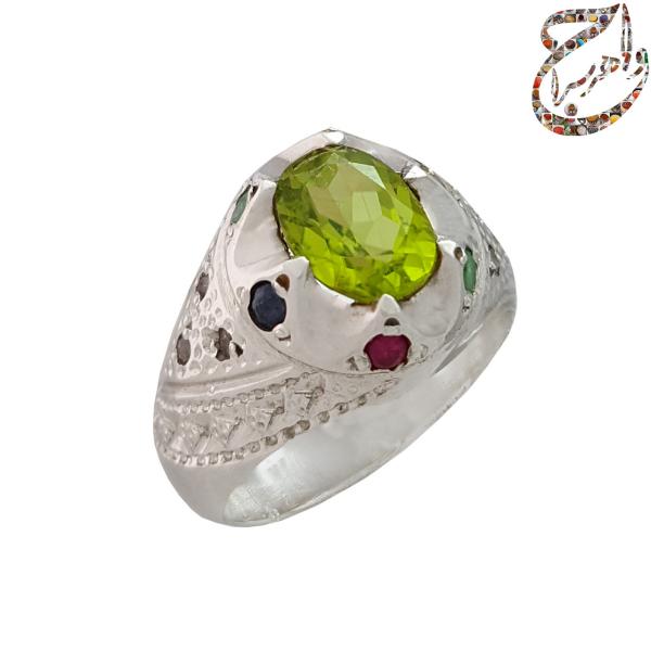 انگشتر مرصع زبرجد معدنی تراش الماسی بدون حکاکی . رکاب نقره یک تکه دست ساز به وزن 6.6 گرم و سایز 63 با قابلیت تغییر سایز.