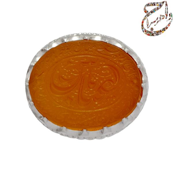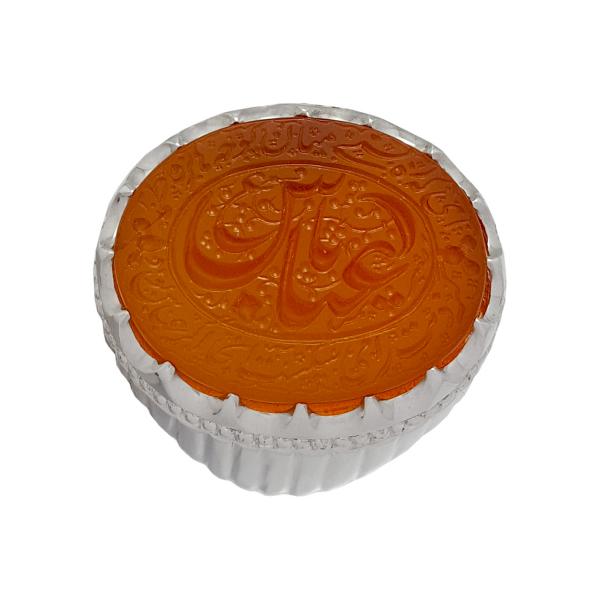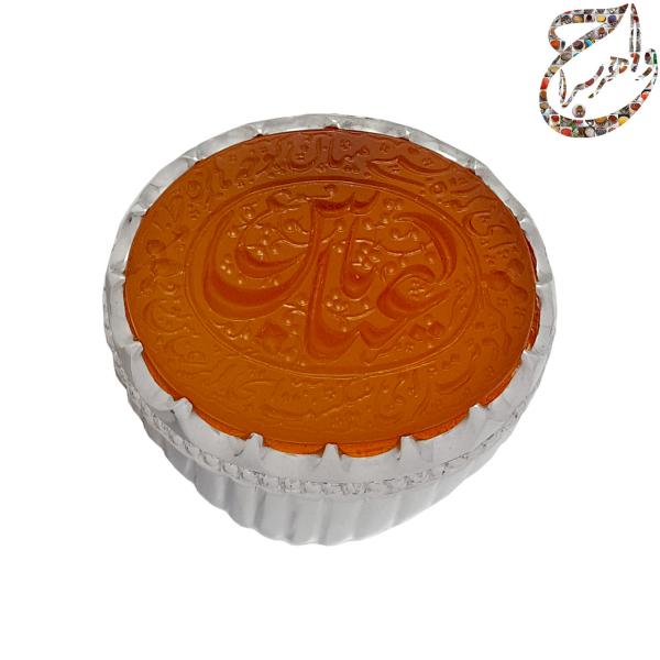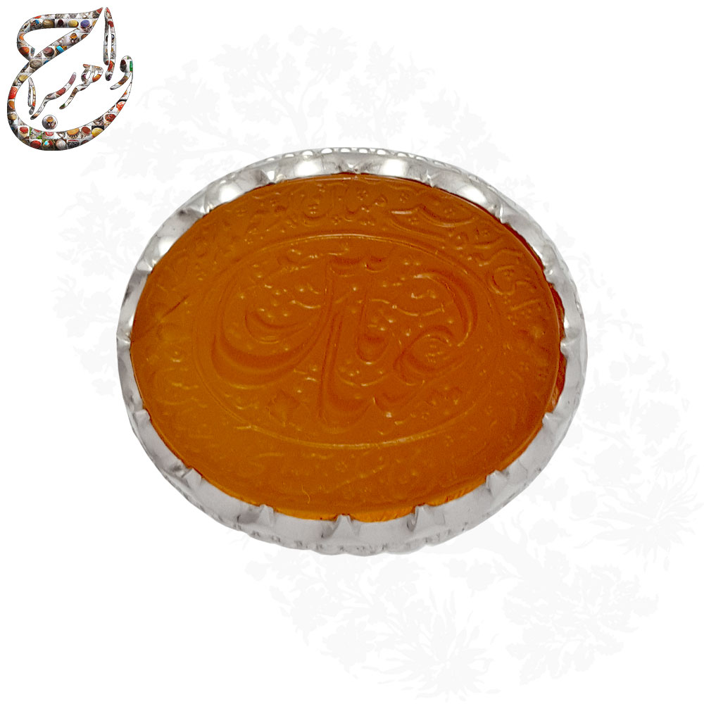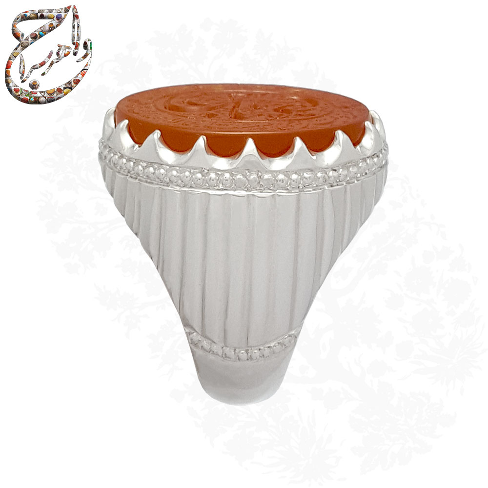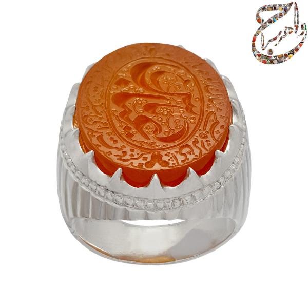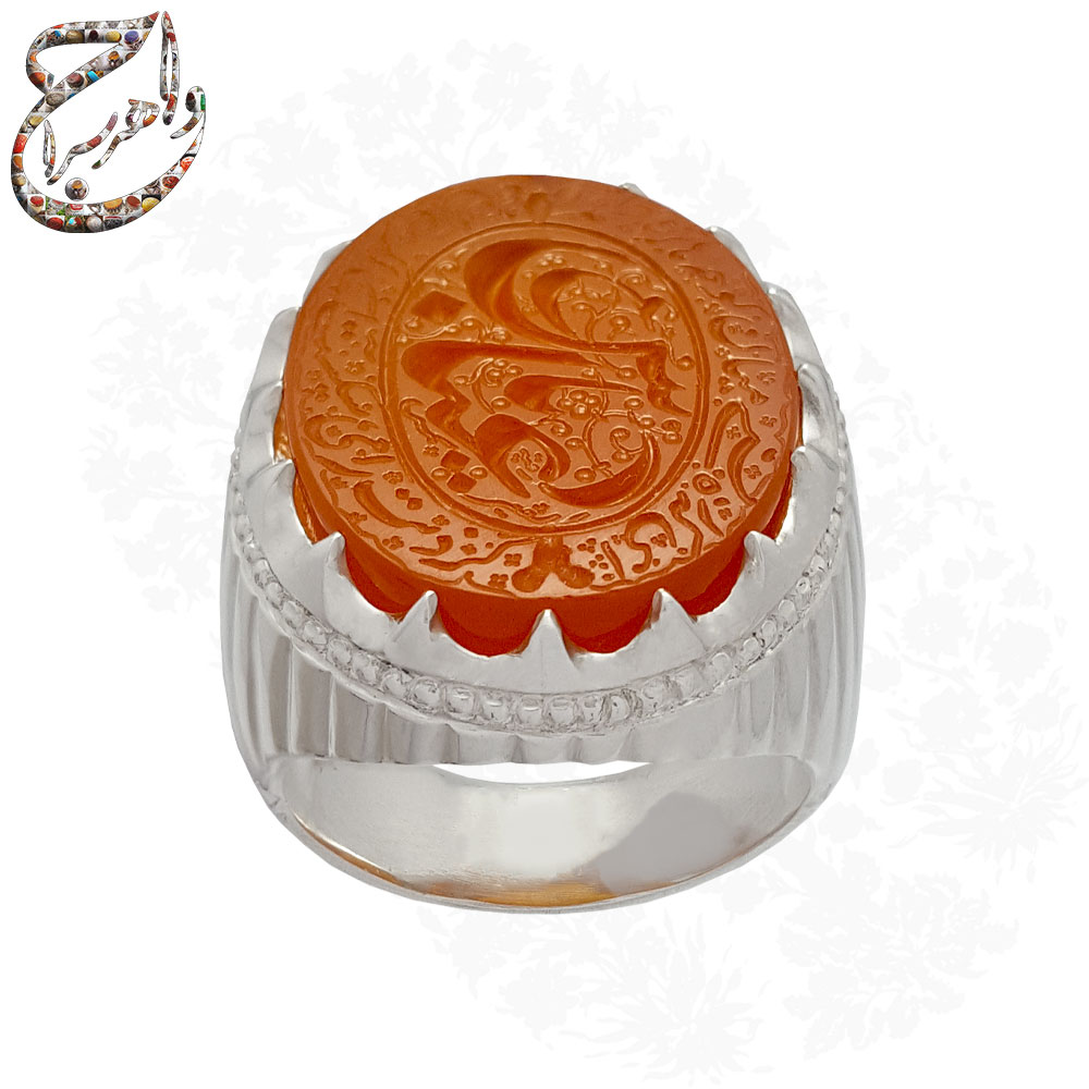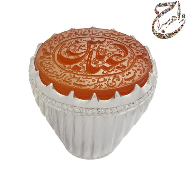 انگشتر عقیق یمنی پرتقالی تراش تخت حکاکی شده توسط استاد مهدی شمس با امضاء الفقیر شمس مزین به ذکر یا عباس و شعر (ای که ره بستی میان کوچه ها بر مادرم / گردنت را میشکست آنجا اگر عباس بود ) . همانطور که در تصویر مشخص است ، قسمتی از سنگ که کلمه (فاطمه سلام الله علیها ) بر روی آن حکاکی شده یک ترک یا شکستگی دارد