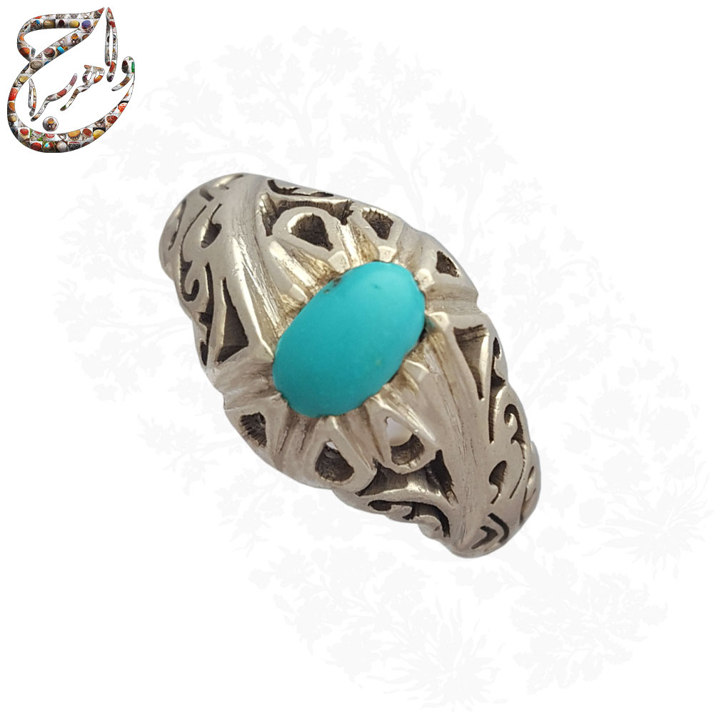 انگشتری که ملاحظه میفرمایید فیروزه نیشابوری ظریف است که توسط استاد عباسی مشهدی به روش بسیار ظریف و به طرح شبکه ای ساخته و توسط جواهرسرا عرضه گردیده است .