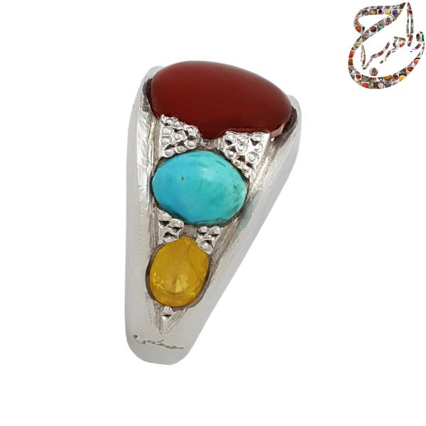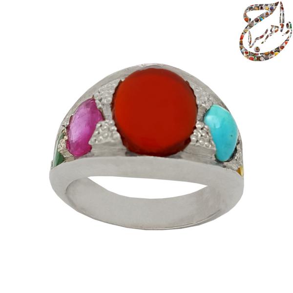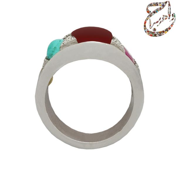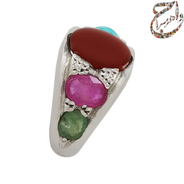 انگشتر پنج نگین عقیق یمنی سرخ ، فیروزه نیشابور ، یاقوت زرد ، یاقوت سرخ و زمرد تراش دامله و برلیان بدون حکاکی . رکاب نقره یک تکه دست ساز به شیوه ی خاک ماسه بدون مهر سازنده به وزن 12.9 گرم و سایز 63 با قابلیت تغییر سایز.