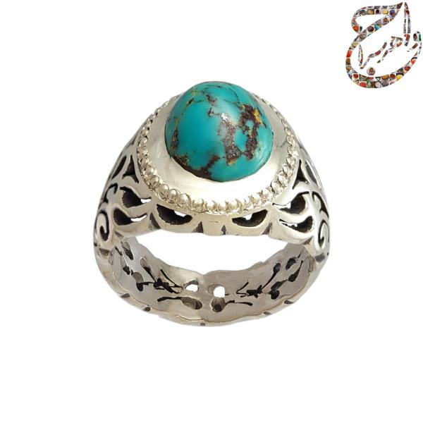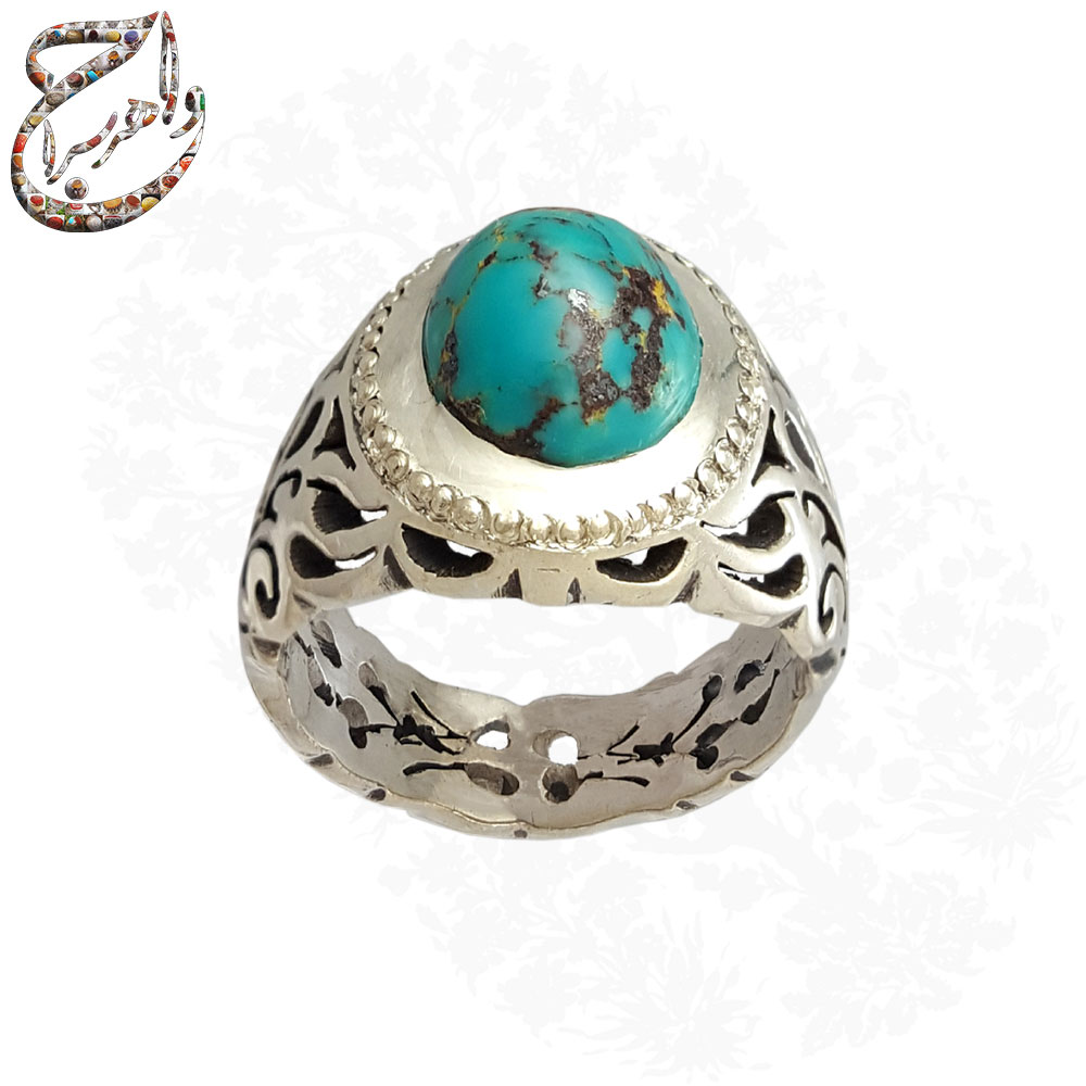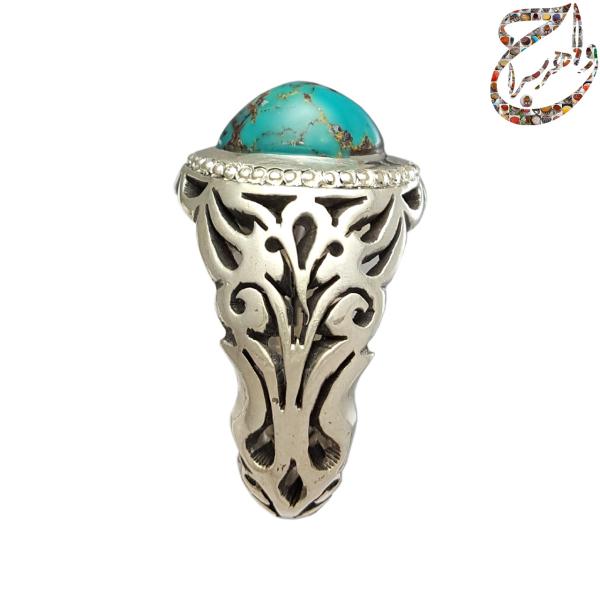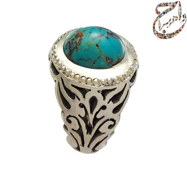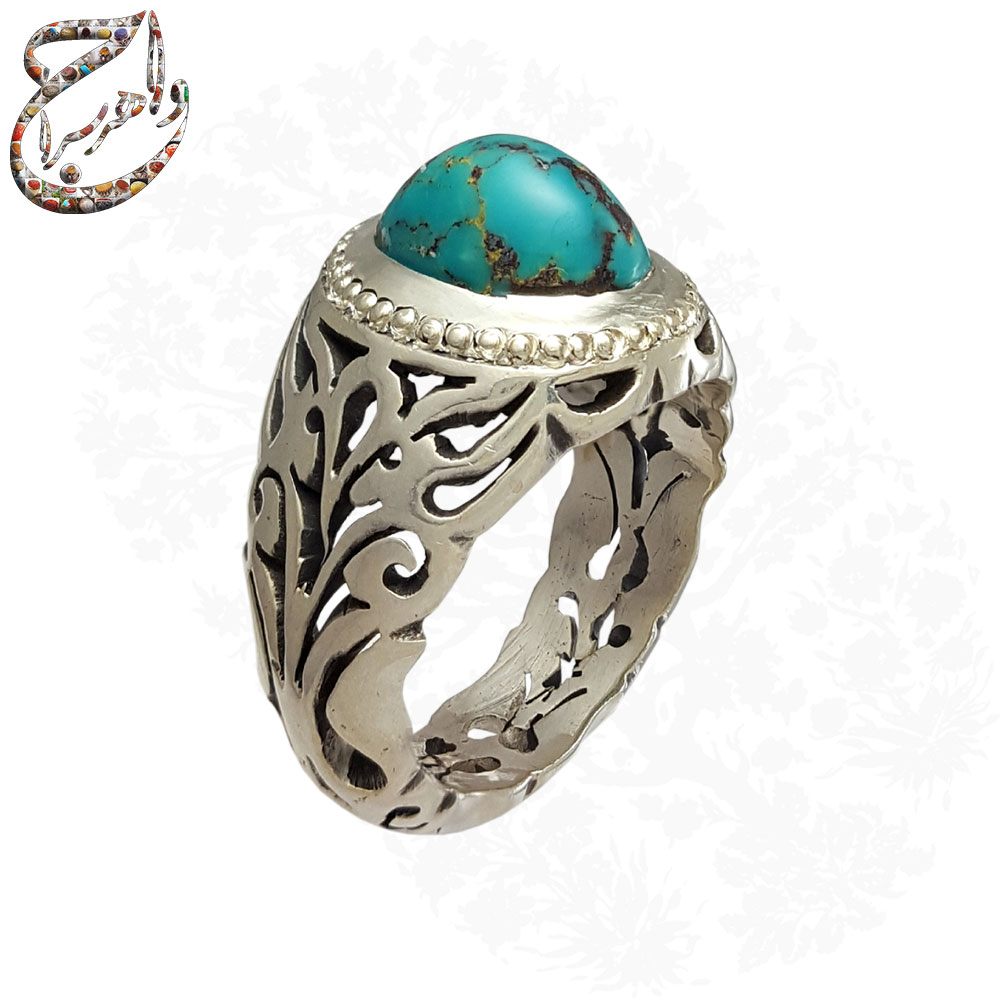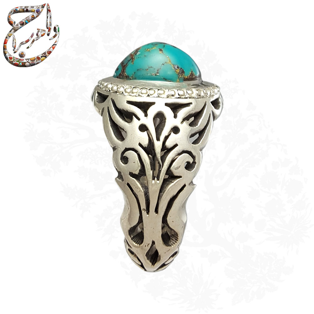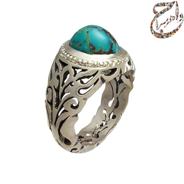 انگشتری که مشاهده میفرمایید از فیروزه نیشابوری سبز درجه یک بهره میبرد . نقوش شجر فیروزه به رنگ طبیعی قهوه ای خود نمایی میکنند و تراش نگین از نوع کله قندی و دامله است که حدود 8 میلیمتر از سطح رکاب ارتفاع دارد .