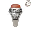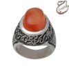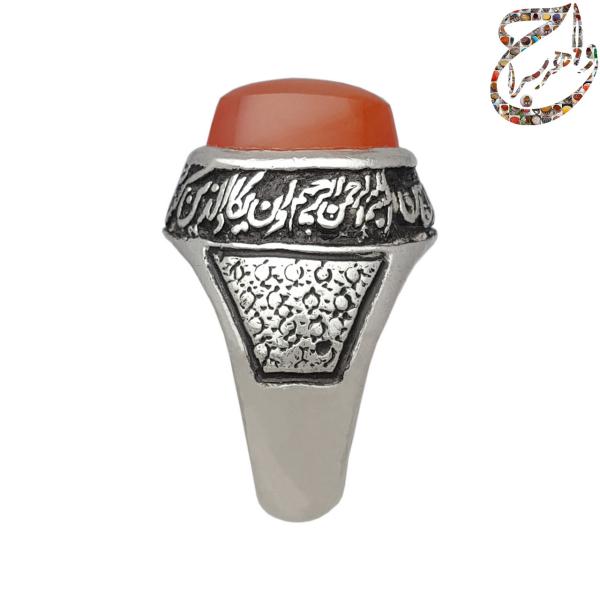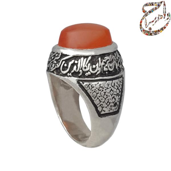 انگشتر عقیق یمنی پرتقالی تراش دامله بدون حکاکی . رکاب نقره یک دو دست ساز به شیوه ی خاک ماسه توسط استاد فرخاری بدون مهر به وزن 18.5 گرم و سایز 60 با قابلیت تغییر سایز و قلمزنی دستی استاد فرخاری .