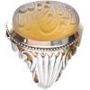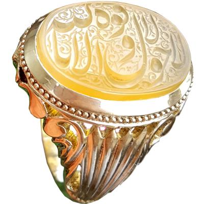 استاد امیر حسین رضیعی اینبار دست به خلق اثری هنری و متفاوت زده اند . این انگشتر که از عقیق نباتی یمنی که بعضی به اشتباه آن را عقیق زرد مینامند بهره میبرد . استاد رضیعی به سفارش جواهرسرا بر روی این عقیق ذکر مبارک و مقدس لا حول و لا قوه الا بالله را حکاکی نموده اند .