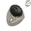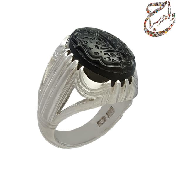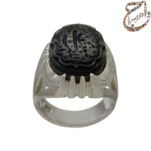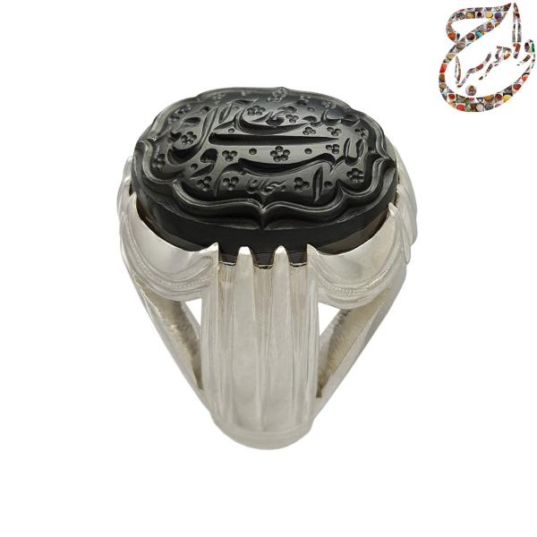انگشتر عقیق مشکی ( اونیکس ) خطی تراش دامله حکاکی شده توسط استاد میثم پلارک با امضاء سبحان مزین به ذکر مبارک صلوات . رکاب نقره دو تکه دست ساز به شیوه ی خاک ماسه توسط استاد حیدری با مهر قم حیدری به وزن 20.7 گرم و سایز 63 با قابلیت تغییر سایز.