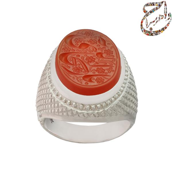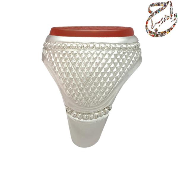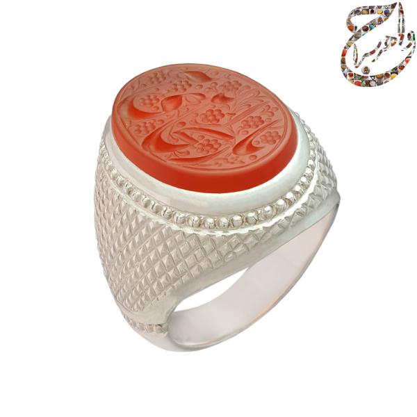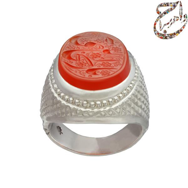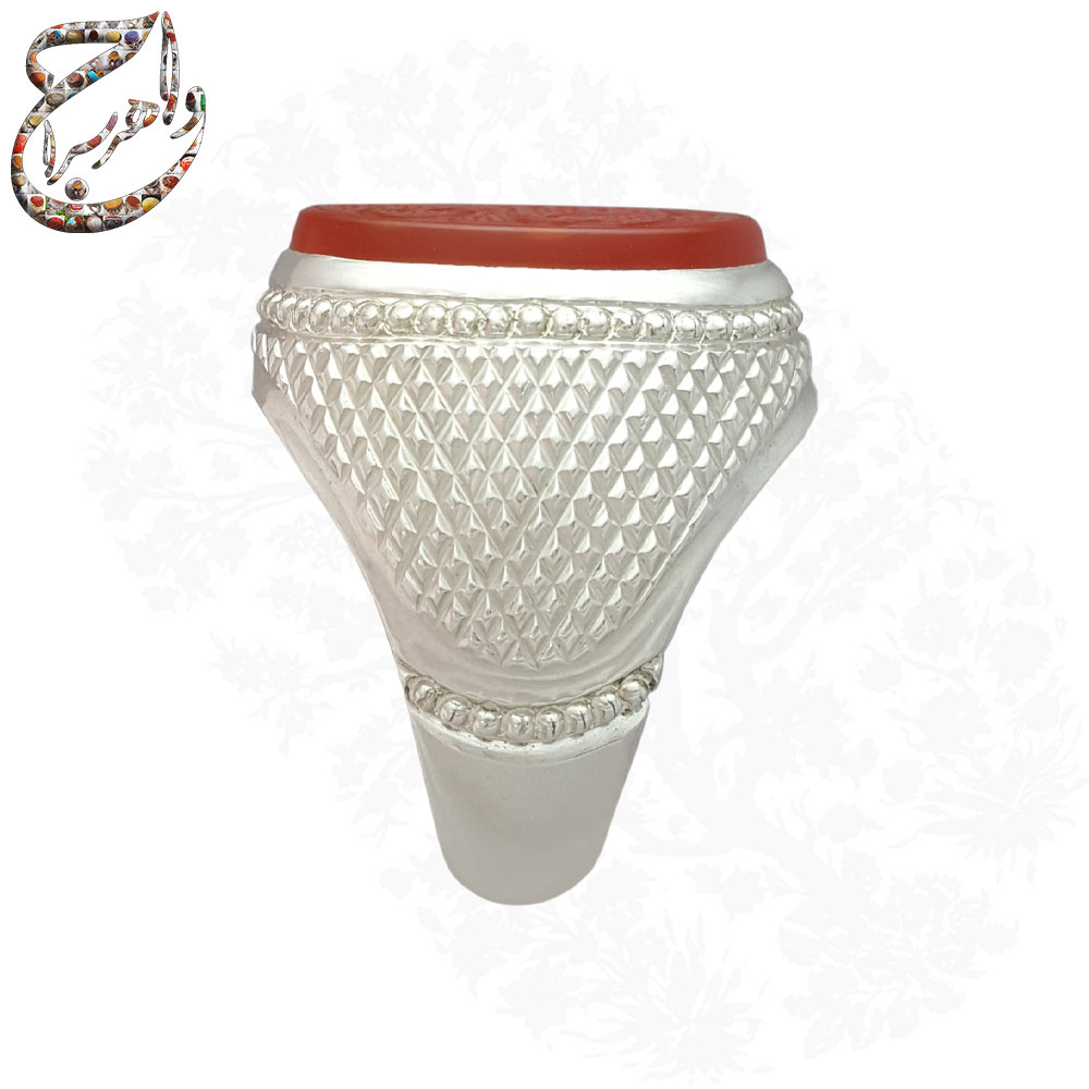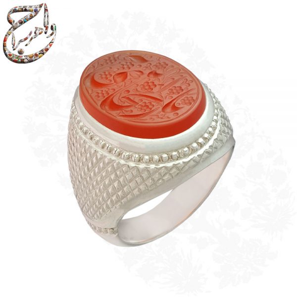 سنگ عقیق سرخ خراسانی با ابعاد 13*18 میلیمتر در این انگشتر بهکار برده شده است. عقیق سرخ اصیل از گذشته تا کنون، از جمله سنگهای پرطرفدار و پرکاربرد در بازار جواهرات بوده است. عقیق این انگشتر با تراش تخت خود بستری مناسب برای حکاکی دستی با دقت و ظرافت بیشتر فراهم آورده است.