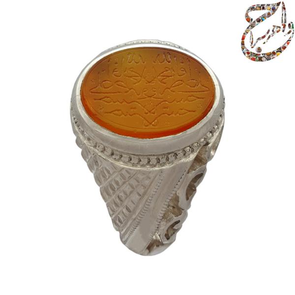 انگشتری که هم اکنون در مقابل چشمان شماست عقیق پرتقالی خطی از هنرمند گرامی ای است که نام او را نمیدانیم . این اثر حکاکی از سبک راست کنی و چپ کنی قرینه ای بهره میبرد . به طوری که هر کلمه از کلمات (الله ، محمد ، علی ، فاطمه ، حسن ، حسین ) به طور قرینه و آئینه ای در مقابل یکدیگر حکاکی گشته است .