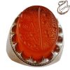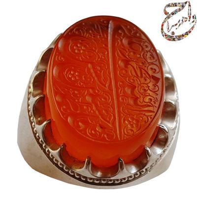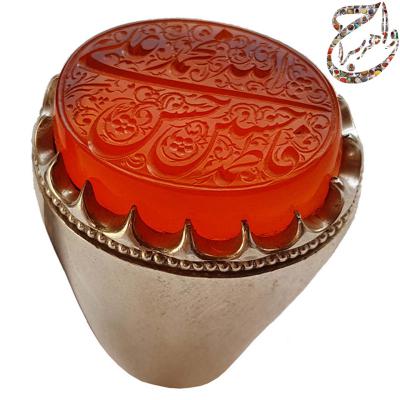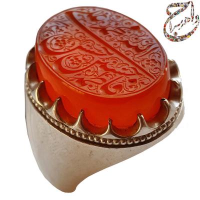 انگشتری که هم اکنون در مقابل چشمان شماست عقیق سرخ یمنی آبدار است که توسط استاد مبین حکاکی شده و مزین به اسامی مبارک خداوند تعالی ، حضرت رسول اکرم صلی الله علیه و آل ، امام علی بن ابیطالب علیه السلام ، حضرت صدیقه کبری سلام الله علیها ، امام حسن مجتبی علیه السلام و حضرت ابا عبد الله الحسین علیه السلام گردیده است .