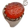 حکاکی بعضی اذکار بر روی انگشتر ها یا بر روی سنگ های خاص ، در روایات ائمه معصومین سفارش شده است . بعضی روایات نیز بیانگر اذکاری هستند که ائمه معصومین بر روی انگشترشان حکاکی کرده و در دست داشته اند . اما حکاکی در غیر از این موارد خالی از لطف و بدون حکمت و بیهوده نیست . اغلب حکاکی هایی که اسامی مبارک ائمه معصومین در آن ذکر شده اند ، با کلمه ی یا شروع میشود که حرف ندا و به معنای استمداد جستن است . به این معنی که بعنوان مثال معنای یا فاطمه الزهراء ، (ما را دریاب ای حضرت زهرا س) میباشد .علاوه بر استمداد جستن از ائمه معصومین ، هدف دیگری را نیز در حکاکی دنبال میکنیم و آن عبارت است از زنده کردن یاد و نام ائمه و یاد آوری مرتب ایشان برای خویش و رهایی از غفلت . امید داریم گاهی نگاه کردن به این اذکار ما را از روزمرگی خارج و متوجه معنویت اسلامی نماید .انگشتری که هم اکنون در مقابل چشمان شماست عقیق سرخ یمنی آبدار است که توسط استاد مبین حکاکی شده و مزین به اسامی مبارک خداوند تعالی ، حضرت رسول اکرم صلی الله علیه و آل ، امام علی بن ابیطالب علیه السلام ، حضرت صدیقه کبری سلام الله علیها ، امام حسن مجتبی علیه السلام و حضرت ابا عبد الله الحسین علیه السلام گردیده است .