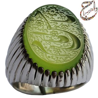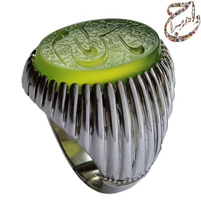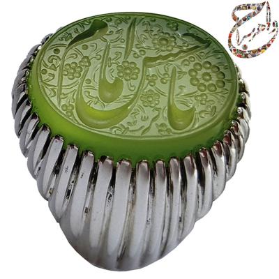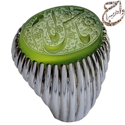 سنگ یا نگین انگشتری که در حال تماشای تصاویر و مشخصات آن هستید عقیق سبز خط استاد رضا قربانی با امضاء حرّ و مزین شده به ذکر مبارک یا امام حسن ع است که بر روی رکاب خیاره ای دست ساز استاد امیر لطفی سوار شده است .