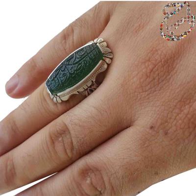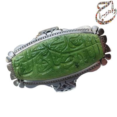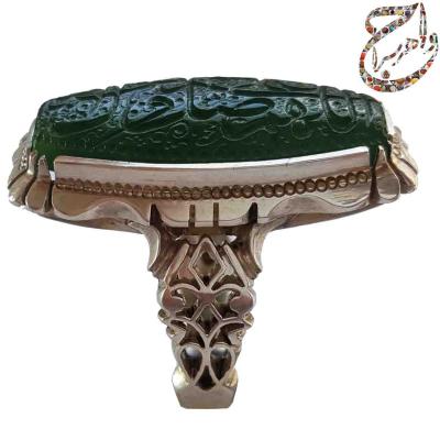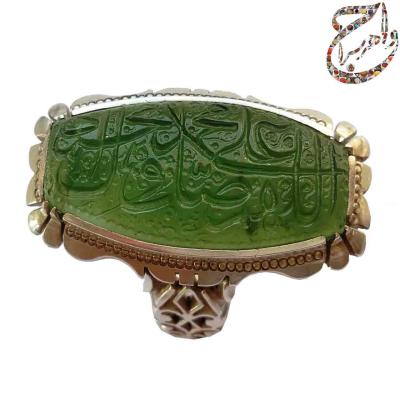 یشم یکی از جواهراتی است که معدن اصلی و با کیفیت آن نسبت به دیگر معادن در ایران عزیز وجود دارد و سالیان طولانیست که در حال بهره برداری از آن هستیم. نگینی که رنگ سیز فسفوری آن به خلاف اکثر سنگ هایی که به رنگ سبز در آمده اند آزمایشگاهی و صنعتی نیست بلکه بصورت طبیعی در این رنگ یافت میشود و با کمی حرارت و زدودن ناخالصی هایش قابل استفاده در کنار جواهرات دیگر میگردد.[/vc_column_text][vc_empty_space height=”20px”][/vc_column][/vc_row][vc_row][vc_column][vc_column_text]انگشتری که هم اکنون مقابل دیدگان محترم شماست یشم ایرانی اصیل است که توسط استاد محسن محرمی حکاکی گردیده و ذکر مبارک صلوات بر محمد و آل محمد صل الله علیه و آله نقش بسته است.