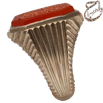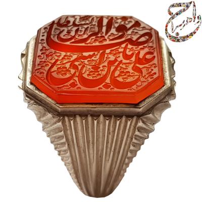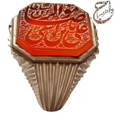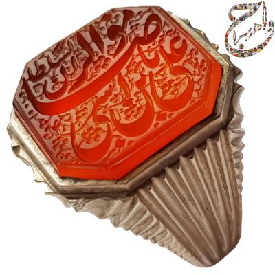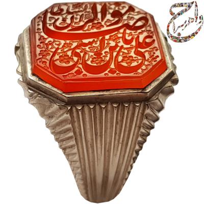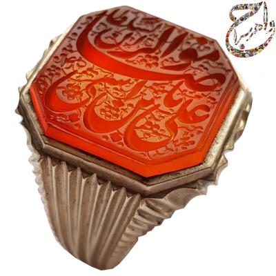 انگشتري كه مشاهده ميفرماييد از عقيق پرتقالي يمني در ابعاد 18 * 18 ميليمتر بهره ميبرد . حكاكي اين انگشتر كه توسط استاد سيد مجتبي آتش باز (ميرزا) انجام شده است مزين به ذكر مبارك يا علي بن موسي الرضا ميباشد . همچنين ركاب انگشتر توسط استاد شيرازي به روش دستساز و مدل ورقه اي ازجنس نقره ساخته و عرضه گرديده است .