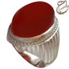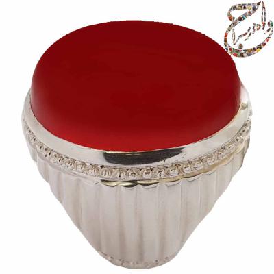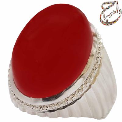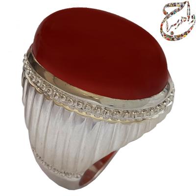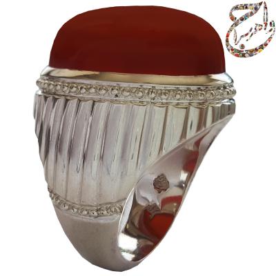 انگشتری که مشاهده میفرمایید از عقیق یمنی درشت سرخ بهره میبرد . رکاب این انگشتر فاخر از جنس نقره عیار 950 به روش دست ساز توسط استاد محمد افتخاری ساخته و ارائه شده است . ابعاد نگین 24 * 16 میلیمتر و سایز رکاب 63 است .