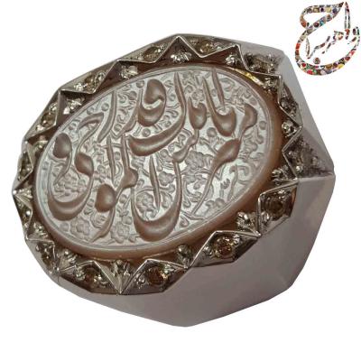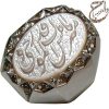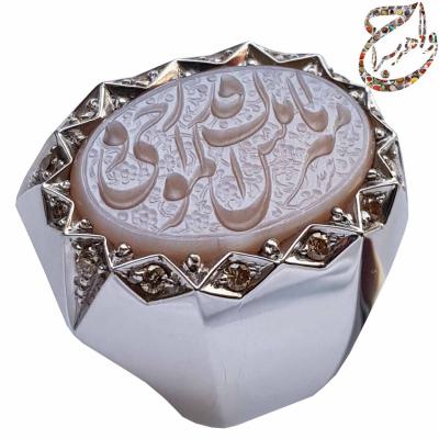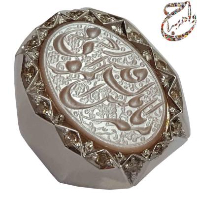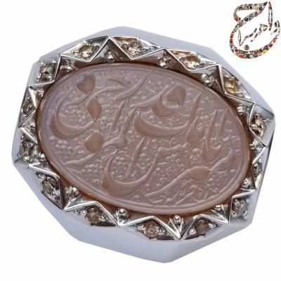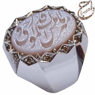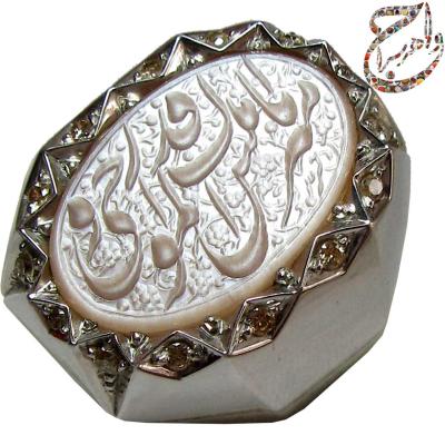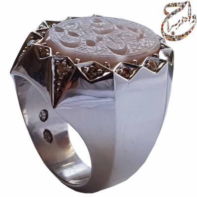 عنوان طولانیست ، اما از هیچ یک از این عناوین نمیتوان گذشت . نگین انگشتر از سنگ زیبای ماه که پیش تر توصیفش کردیم است . نگین فاخر و اصیل انگشتر ، توسط استاد رضا قربانی با امضاء حرّ حکاکی شده و به ذکر مبارک روحی فداک یا امیر المومنین علیه السلام مزین گردیده است . رکاب انگشتر نیز توسط استاد مصطفی ابوالحسنی با مهر (عابد ایران) به شیوه ی دست ساز و مدل فیلی هشت پر ساخته و پرداخته شده است . نگین های مخراجی انگشتر که توسط ید باکفایت استاد امینی به صورت چهارده کنگره بر روی رکاب جای گرفته اند همگی برلیان اصل و طبیعی و قیمتی است .