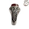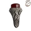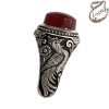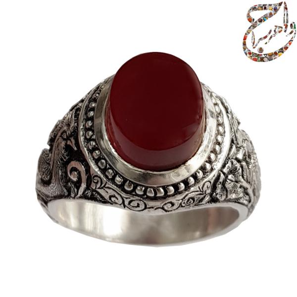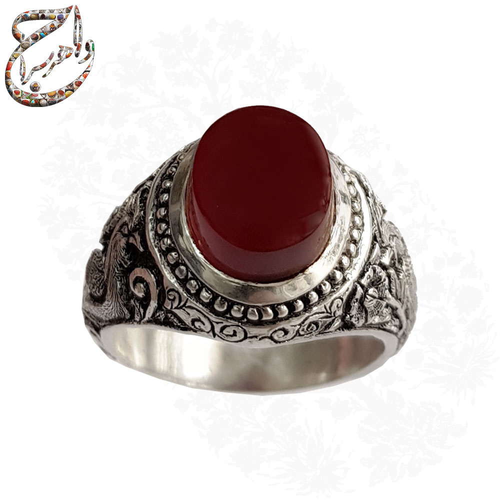 انگشتر عقیق یمنی سرخ تراش دامله بدون حکاکی. رکاب نقره دست ساز به شیوه ی خاک ماسه توسط استاد جنگی به وزن 15.2 گرم و سایز 63 با قابلیت تغییر سایز و قلمزنی دستی استاد محسن جنگی با دو مهر جنگی در زیر رکاب.