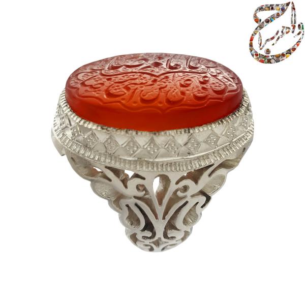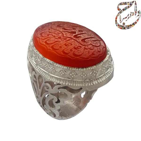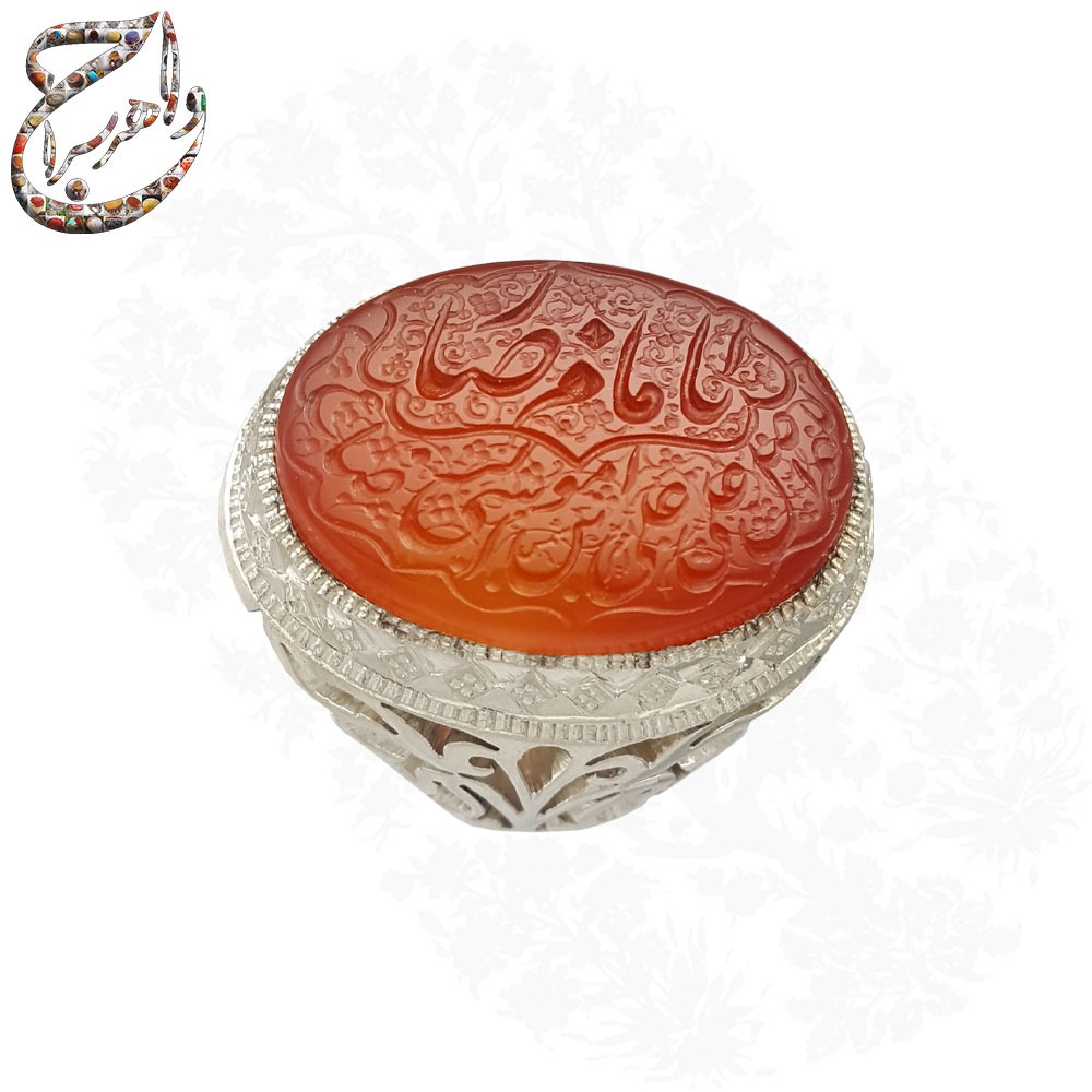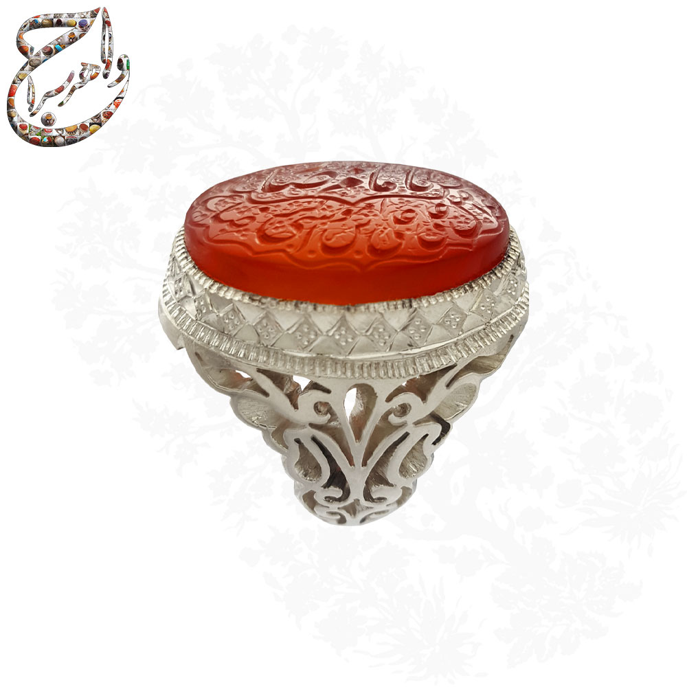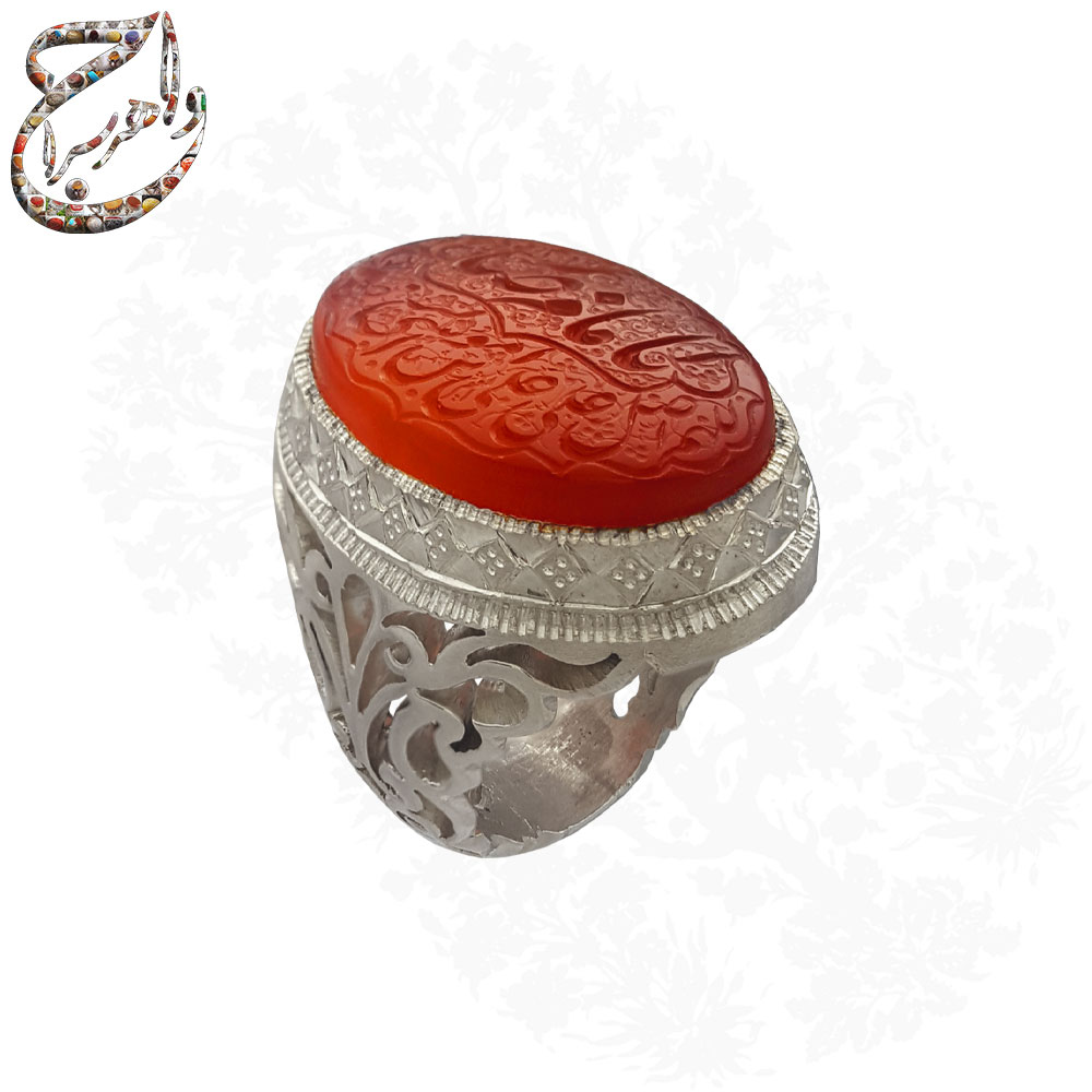 انگشتری که مشاهده میفرمایید از عقیق سرخ یمنی بهره میبرد . حکاکی این اثر یکی از شاهکار های استاد مهدی شمس زنجانی است که به شیوه ی دست نویس حکاکی شده است . عبارت اللهم صل علی علی بن موسی الرضا بصورت کم عمق و عبارت یا امام رضا علیه السلام به صورت عمیق حکاکی شده است . رکاب انگشتر از جنس نقره به شیوه ی دست ساز مشهدی طرح شبکه ای و آئینه کاری ساخته و پرداخته شده است .برای کسب اطلاعات بیشتر و دسترسی به ابعاد و وزن و سایز و … میتوانید به قسمت اطلاعات تکمیلی مراجعه بفرمایید . انگشتری که مشاهده میفرمایید از عقیق سرخ یمنی بهره میبرد . حکاکی این اثر یکی از شاهکار های استاد مهدی شمس زنجانی است که به شیوه ی دست نویس حکاکی شده است . عبارت اللهم صل علی علی بن موسی الرضا بصورت کم عمق و عبارت یا امام رضا علیه السلام به صورت عمیق حکاکی شده است . رکاب انگشتر از جنس نقره به شیوه ی دست ساز مشهدی طرح شبکه ای و آئینه کاری ساخته و پرداخته شده است .برای کسب اطلاعات بیشتر و دسترسی به ابعاد و وزن و سایز و … میتوانید به قسمت اطلاعات تکمیلی مراجعه بفرمایید .