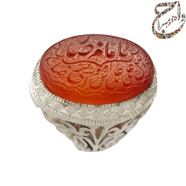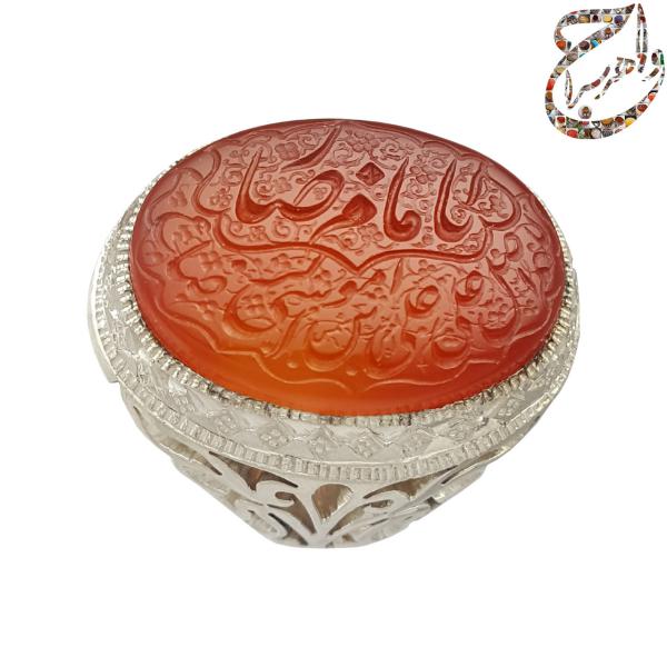 انگشتری که مشاهده میفرمایید از عقیق سرخ یمنی بهره میبرد . حکاکی این اثر یکی از شاهکار های استاد مهدی شمس زنجانی است که به شیوه ی دست نویس حکاکی شده است . عبارت اللهم صل علی علی بن موسی الرضا بصورت کم عمق و عبارت یا امام رضا علیه السلام به صورت عمیق حکاکی شده است . رکاب انگشتر از جنس نقره به شیوه ی دست ساز مشهدی طرح شبکه ای و آئینه کاری ساخته و پرداخته شده است .
