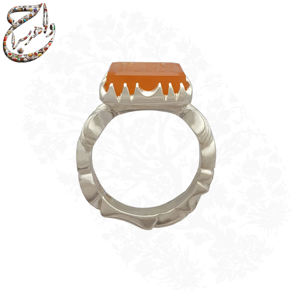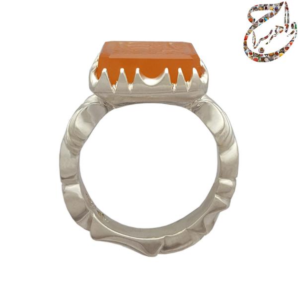 این انگشتر با سنگ عقیق پرتقالی یمنی ساخته شده که به دلیل کیفیت عالی، رنگ پرتقالی زنده و شفاف، از محبوبترین انواع عقیق به شمار میآید. تراش تخت این عقیق، ظاهری زیبا و خاص به آن بخشیده و بر جلوه بصری آن افزوده است.