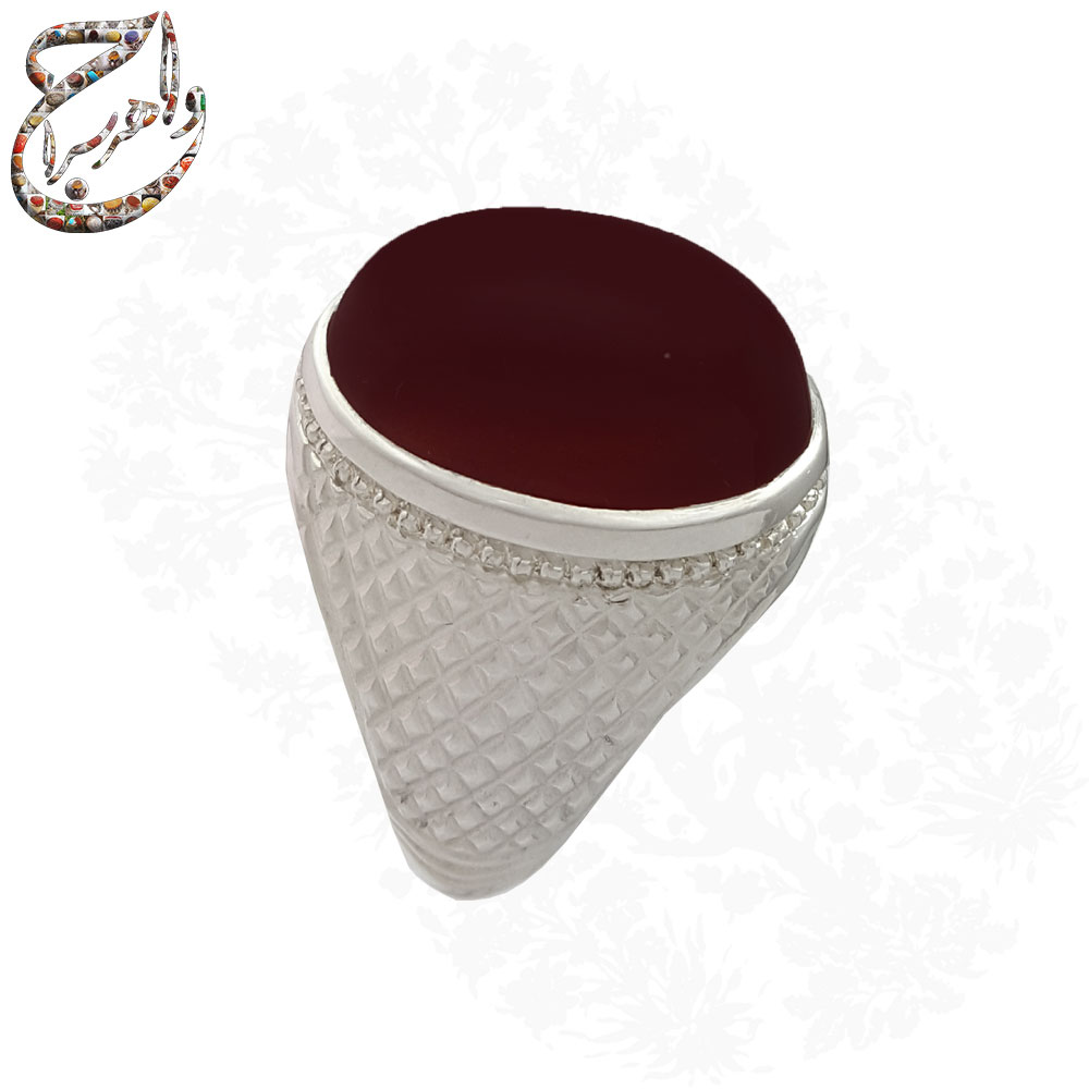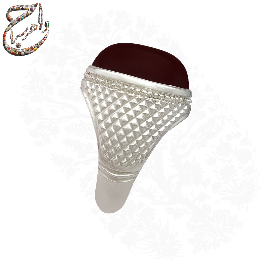 انگشتر عقیق کرزی اصیل تراش دامله بدون حکاکی . رکاب نقره دو تکه دست ساز به شیوه ی خاک ماسه توسط استاد محمودی با مهر تهران محمودی به وزن 18 گرم و سایز 64 با قابلیت تغییر سایز .