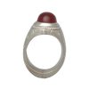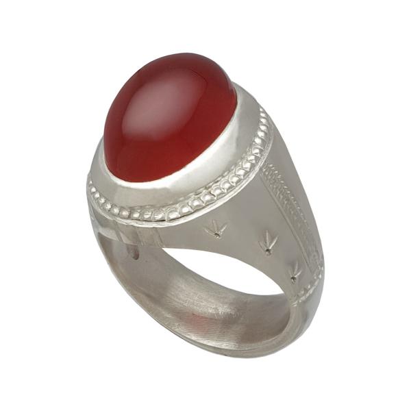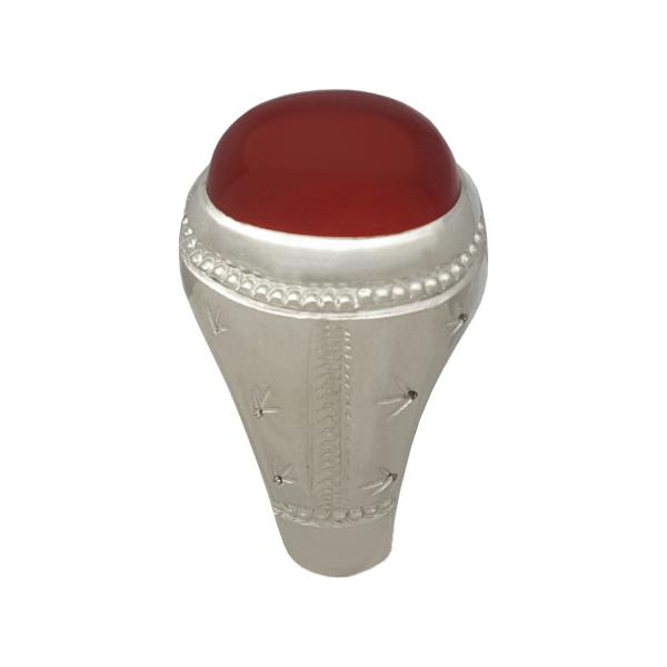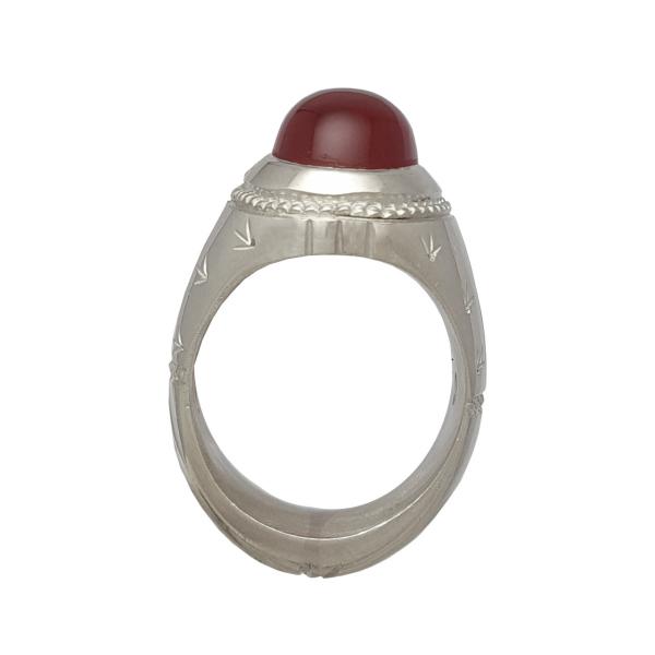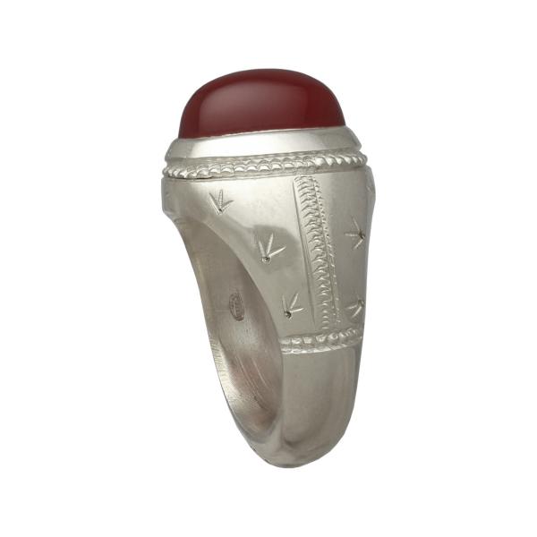 انگشتر عقیق یمنی سرخ تراش دامله بدون حکاکی. رکاب نقره دو تکه دست ساز به شیوه ی خاک ماسه توسط استاد سید اسدالله حسنی با مهر تهران سید به وزن 27 گرم و سایز 63 با قابلیت تغییر سایز.