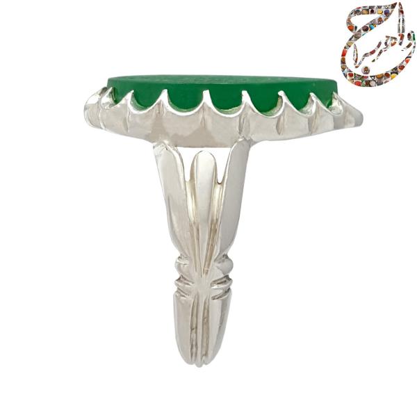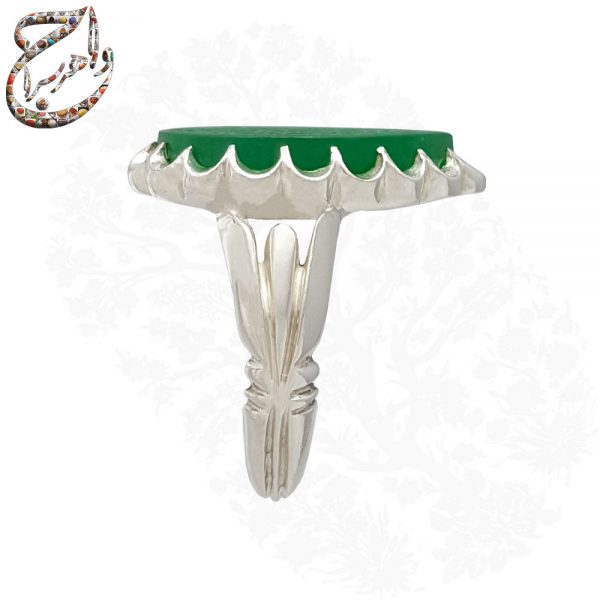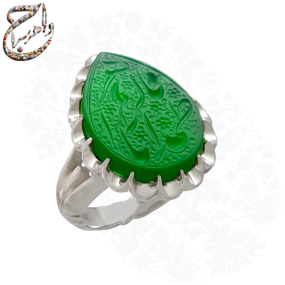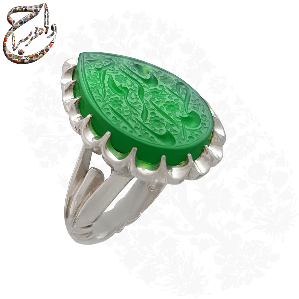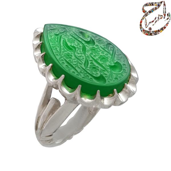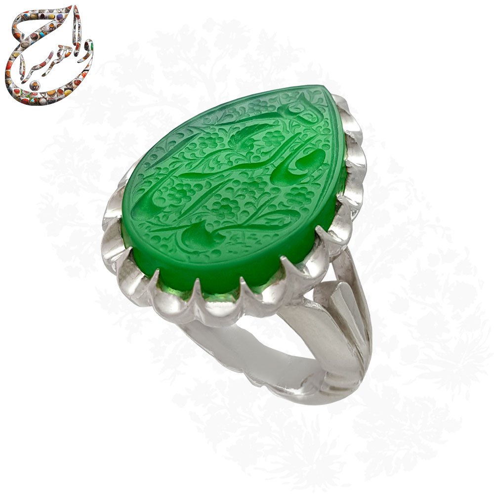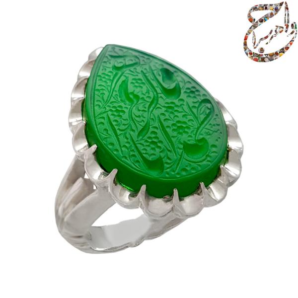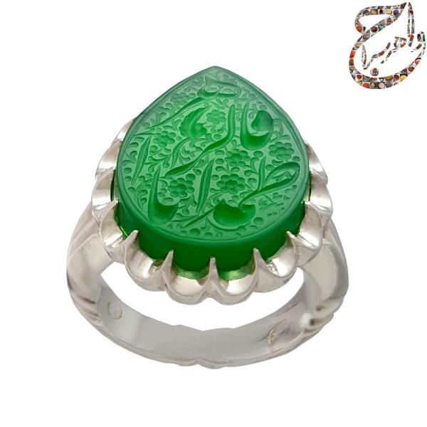 انگشتر عقیق سبز معدنی تراش اشکی مزین به حکاکی استاد اصغرپور با امضاء متین