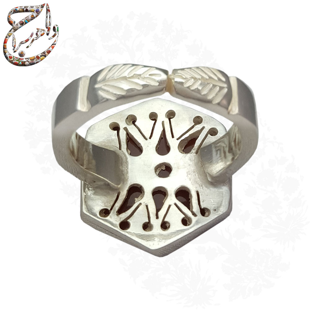 سنگ پرطرفدار: در این اثر از سنگ پرطرفدارعقیق سرخ یمنی با رنگی چشم نواز و شفافیت بالا بهره برده شده که به انگشتر جلوه‌ای زیبا و با شکوه می‌بخشد.