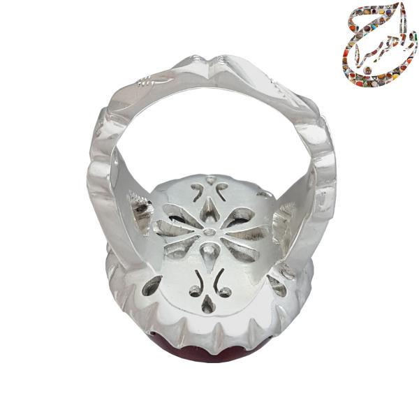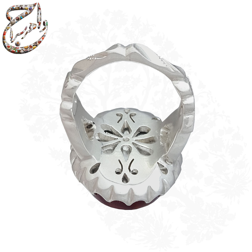 سنگ عقیق سرخ یمنی اصل در این انگشتر استفاده شده که به علت توصیه های ائمه برای به همراه داشتن آن و همچنین رنگ جذاب و شفافیت بالا همواره بسیار مورد توجه علاقه مندان به جواهرات مزین به سنگ بوده است. نگین این انگشتر در ابعاد 20*26 و بصورت تخت تراش خورده است. تراش تخت علاوه بر اینکه جلوه طبیعی سنگ را حفظ میکند بستری مناسب برای حکاکی اذکار هم فراهم می آورد.