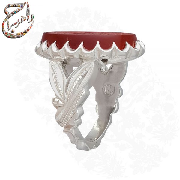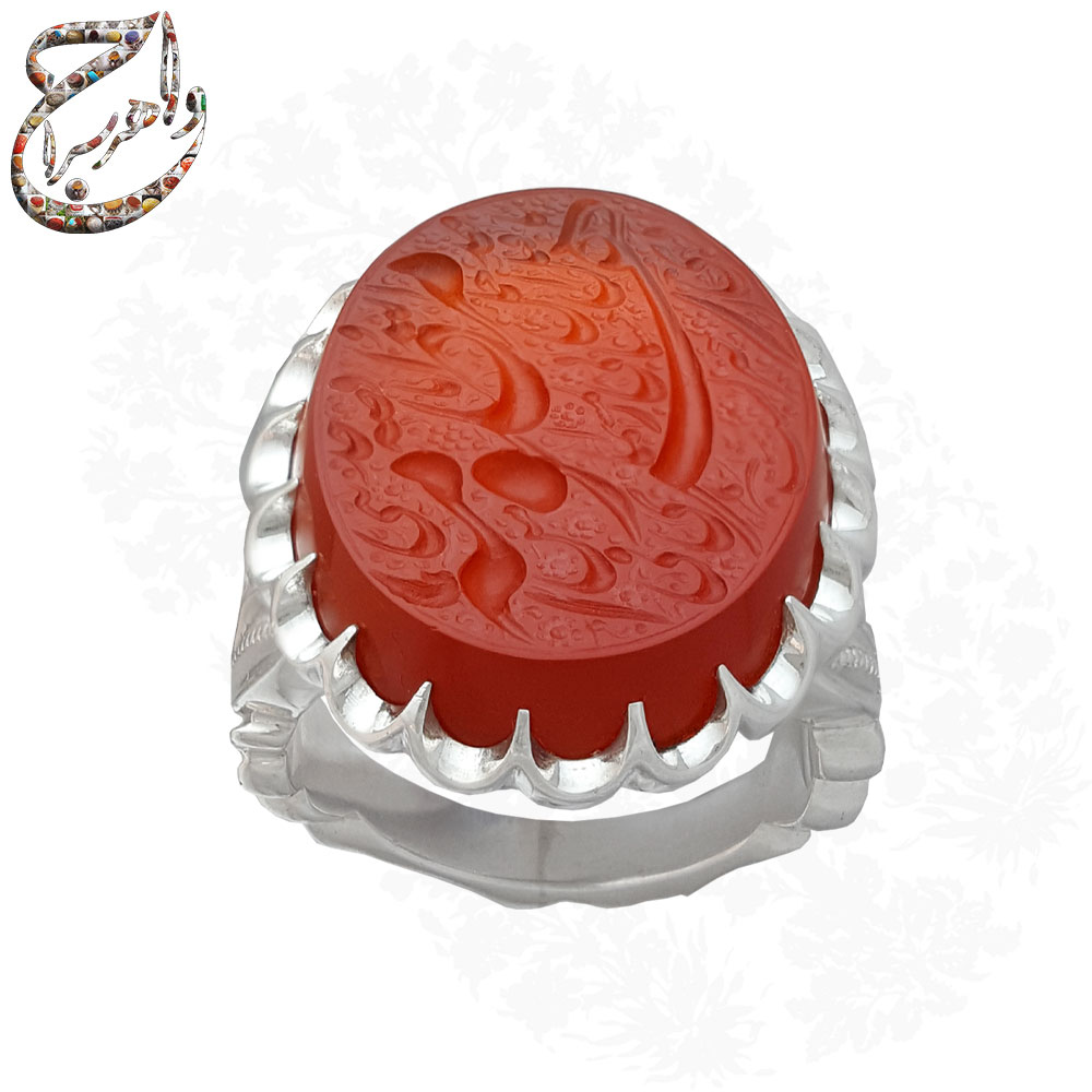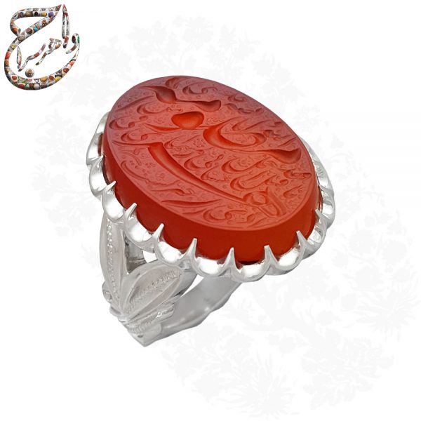 انگشتر عقیق سرخ یمنی با حکاکی «یا زهرا مظلومه (س)» وغبار نویسی دستی استاد ابراهیم اصغرپور و امضای متین به همراه رکاب نقره دست ساز یک تکه و مدل برگی که توسط استاد محسن فتوحی و با مهر تهران فتوحی ساخته شده است. این انگشتر با 17.6 گرم و سایز 63 بوده که قابلیت تغییر سایز نیز دارد.