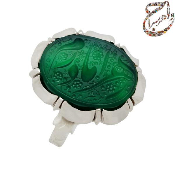 انگشتر عقیق سبز زمردی حکاکی استاد ابراهیم اصغرپور با امضاء متین مزین به عبارت زیبای ( زهرا مادرم (س))