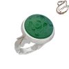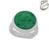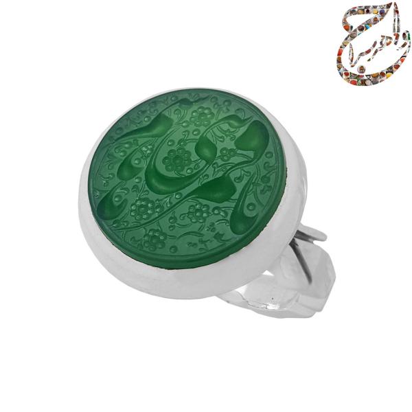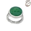 انگشتر عقیق سبز معدنی تراش تخت حکاکی شده توسط استاد ابراهیم اصغر پور با امضاء متین مزین به ذکر مبارک یا قمر بنی هاشم . رکاب نقره سه تکه دست ساز به شیوه ی خاک ماسه توسط استاد محسن فتوحی با مهر تهران فتوحی به وزن 14 گرم و سایز 63 با قابلیت تغییر سایز.
