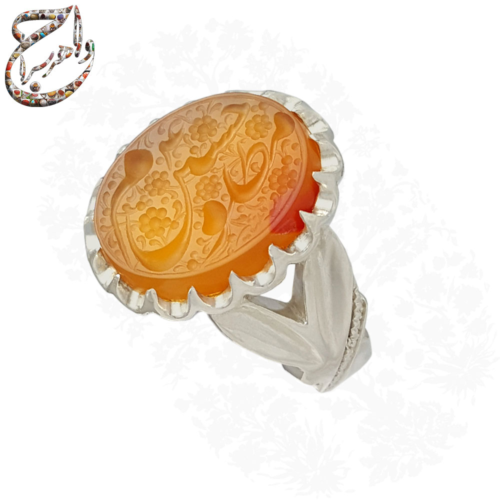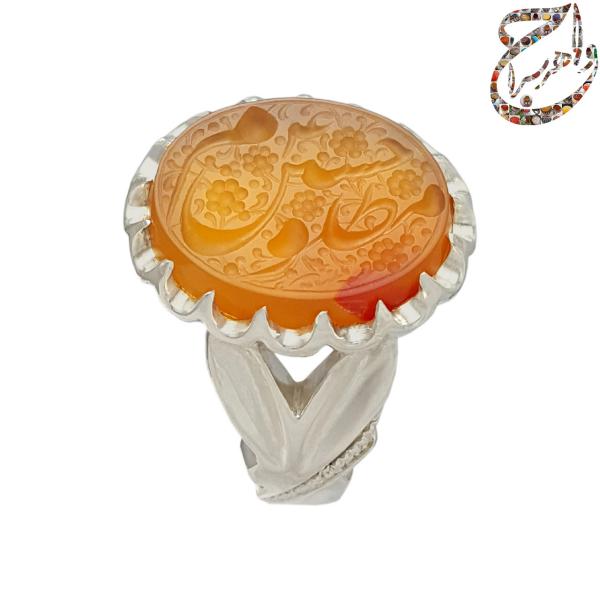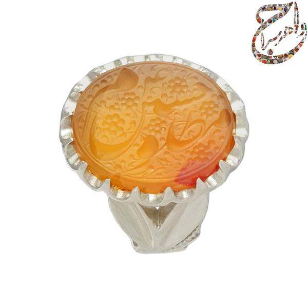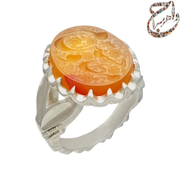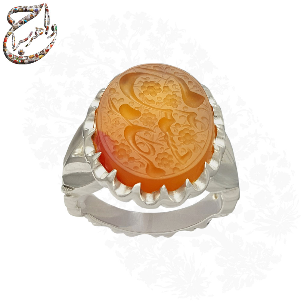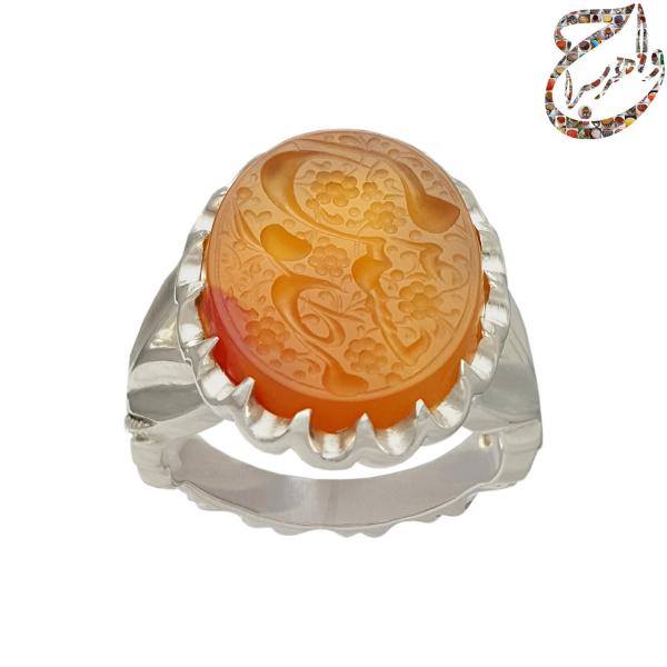 عقیق پرتقالی یمنی به علت داشتن رنگ گرم، رگههای طبیعی و ساختار معدنی مرغوب، از جمله سنگ های مورد توجه در جواهرات سنتی است. لکههای طبیعی در ساختار برخی سنگ، نشانهای از اصالت و طبیعی بودن آن هستند و به سنگ جلوه منحصربهفرد میدهند. عقیق به کترگرفته شده در این انگشتر دارای تراش تخت است، که سطحی مناسب برای اجرای حکاکیهای دقیق و خطی فراهم کرده است.
