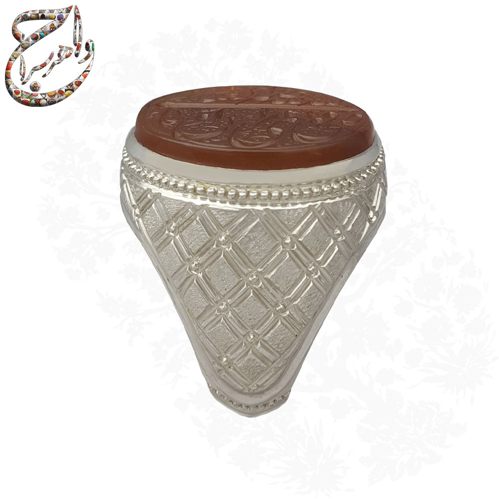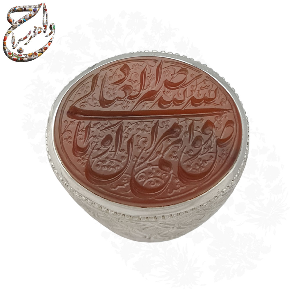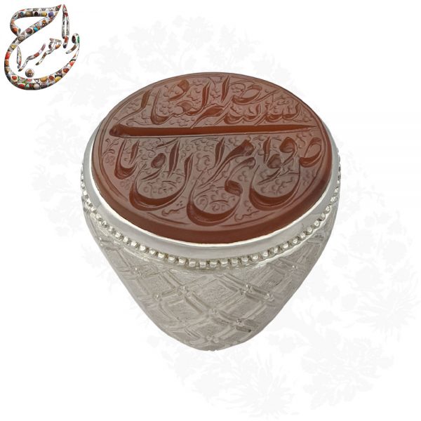 ذکر قرآنی «أفوض أمری إلی الله، إن الله بصیر بالعباد» با خطی زیبا توسط استاد شمس با مهارت کامل بر روی سنگ این انگشتر حک شده است. اجرای دقیق این متن طولانی ، نشان از تسلط هنرمند بر اصول خوشنویسی و حکاکی سنگهای زینتی است. این متن قرآنی مفهومی عمیق درباره توکل، واگذاری امور به خدا، بینش الهی و آرامش درونی دارد.