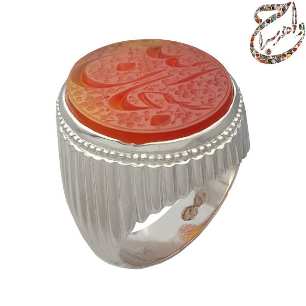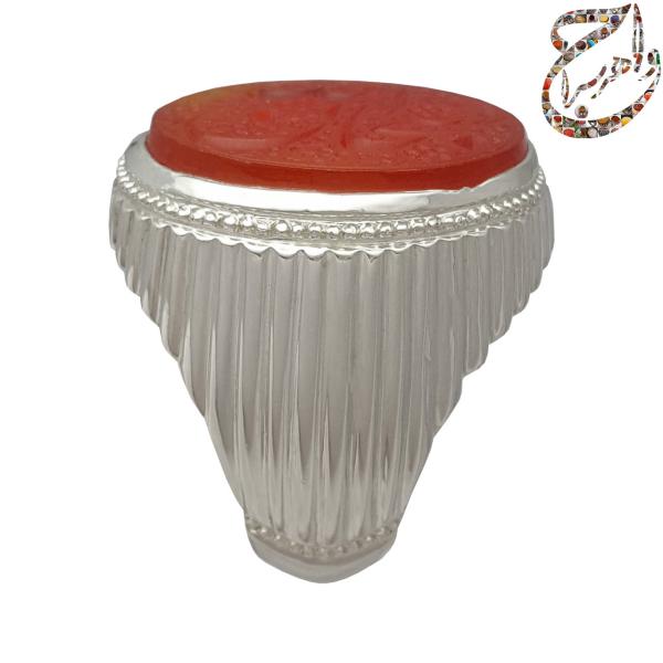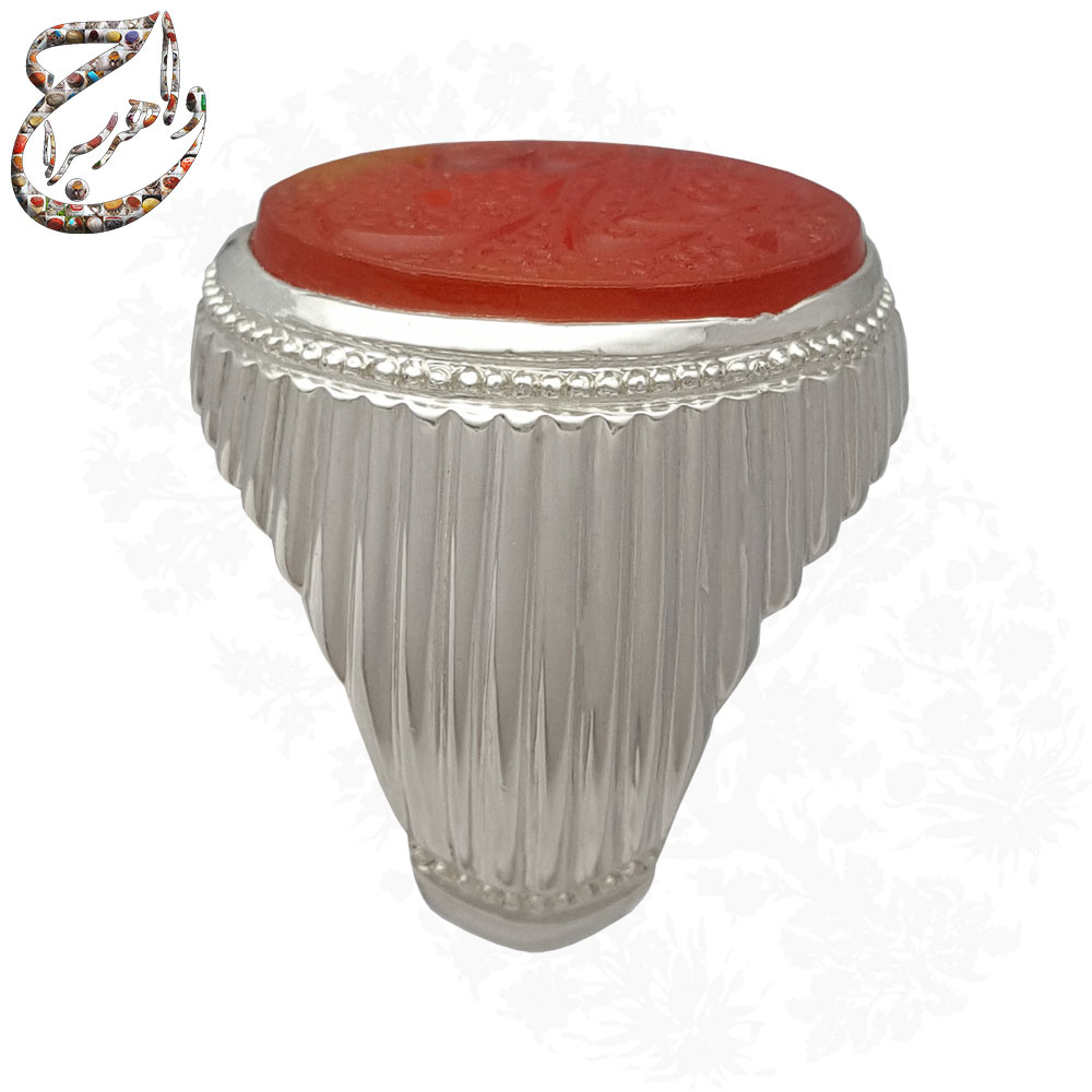 انگشتر عقیق یمنی سرخ تراش تخت حکاکی شده توسط استاد علی همتی با امضاء حم مزین به ذکر مبارک سبحان الله . رکاب نقره یک تکه دست ساز به شیوه ی خاک ماسه توسط استاد وحید امامی با مهر تهران امامی به وزن 20.4 گرم و سایز 63 با قابلیت تغییر سایز.