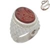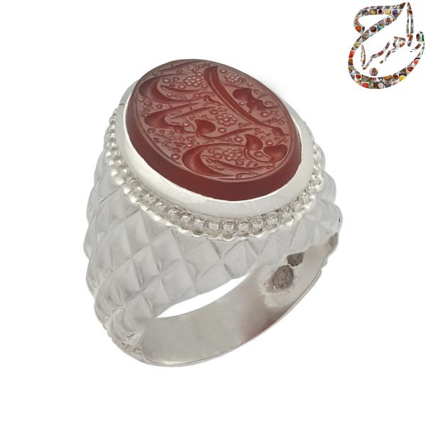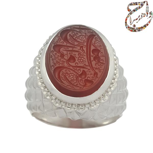 انگشتر عقیق یمنی سرخ تراش تخت حکاکی شده توسط استاد ابراهیم اصغر پور با امضاء متین مزین به ذکر مبارک رفع الله رایه العباس ( خداوند بلند کند پرچم عباس ع را . رکاب نقره یک تکه دست ساز به شیوه ی خاک ماسه توسط استاد امامی با مهر تهران امامی به وزن 17.1 گرم و سایز 63 با قابلیت تغییر سایز.