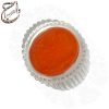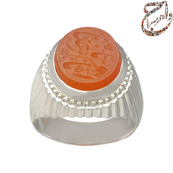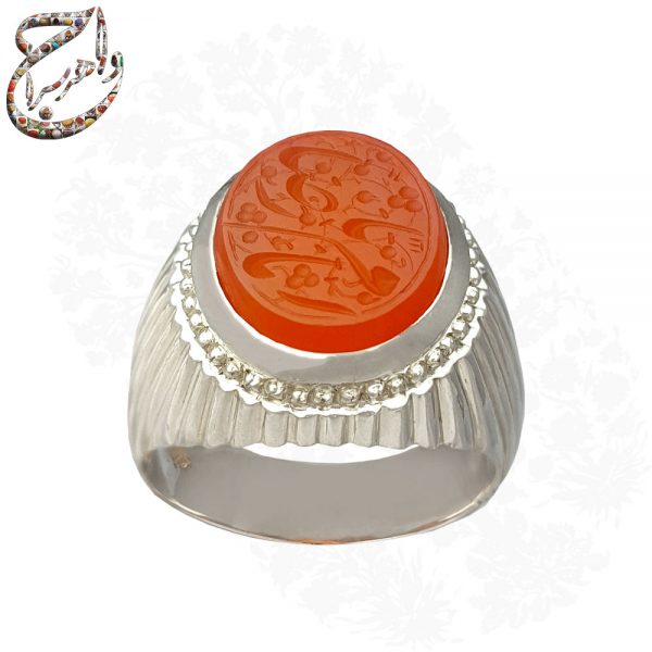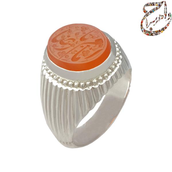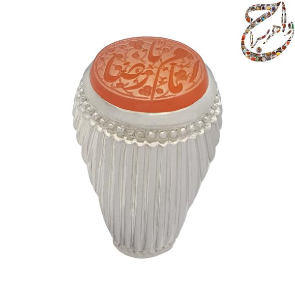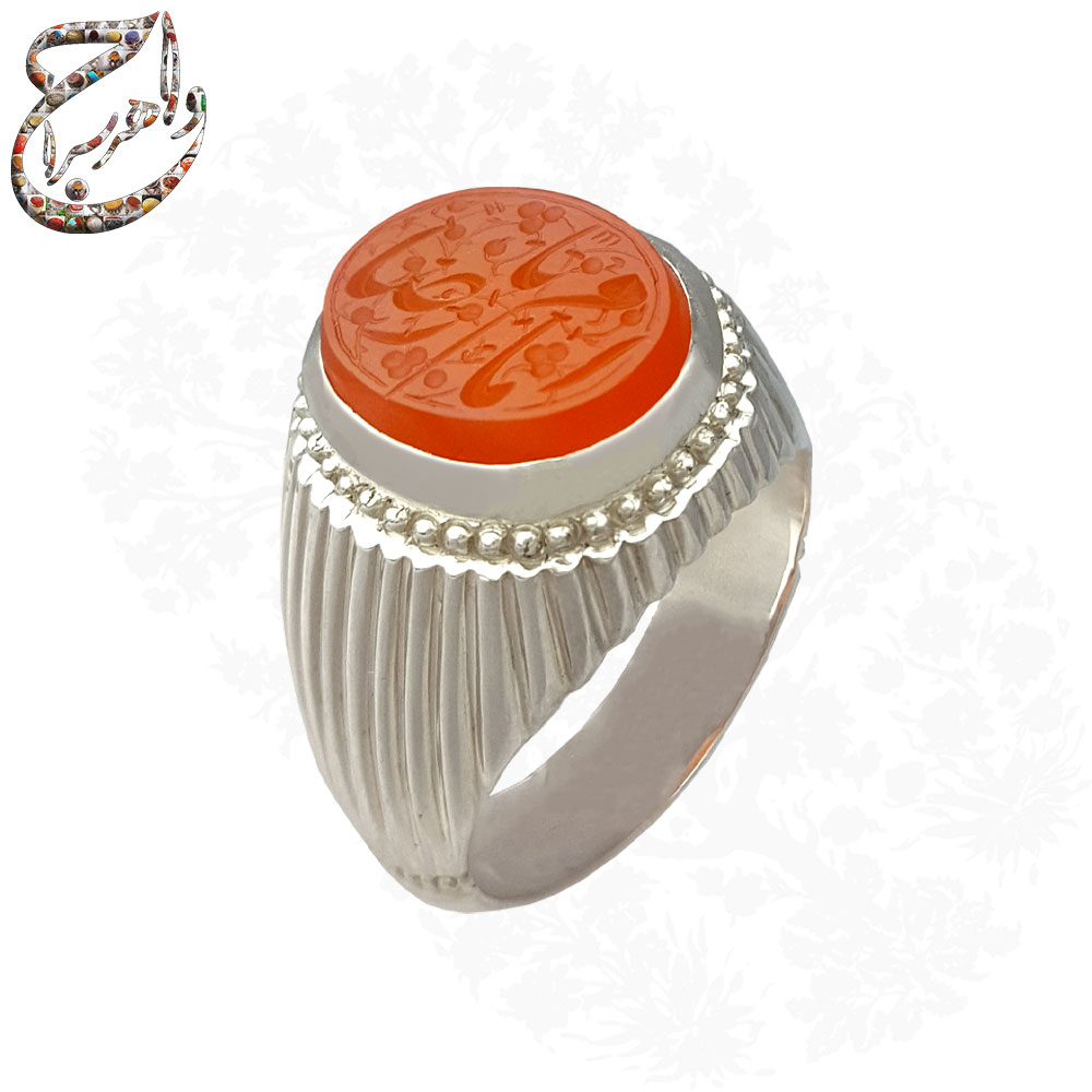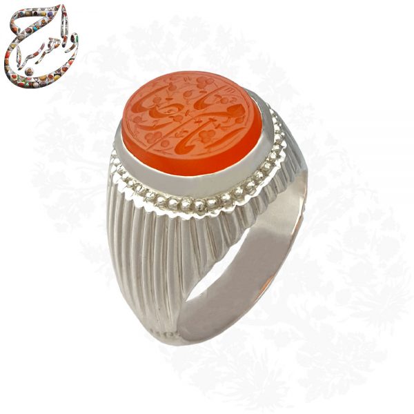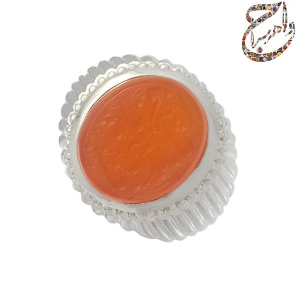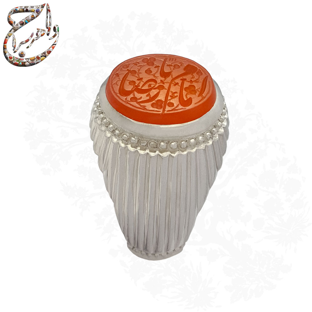 انگشتر عقیق یمنی پرتقالی تراش تخت حکاکی شده توسط استاد مدنی با امضاء س110 مزین به ذکر مبارک یا امام رضا ع . رکاب نقره دو تکه دست ساز به شیوه ی خاک ماسه توسط استاد امامی با مهر تهران امامی به وزن 13.7 گرم و سایز 63 با قابلیت تغییر سایز.
