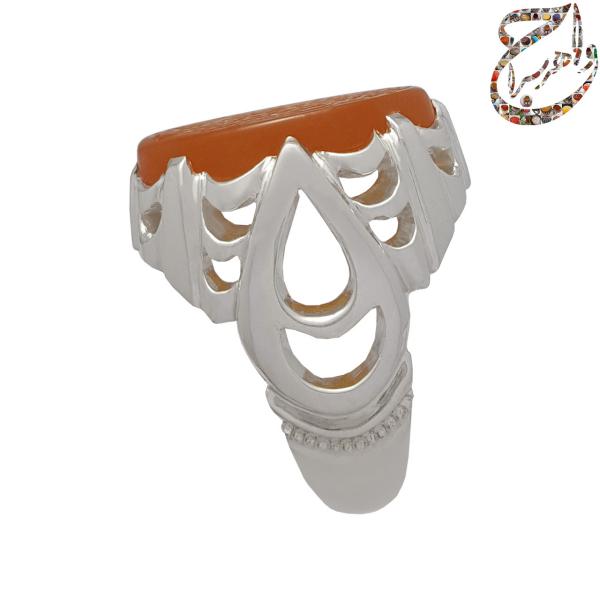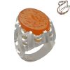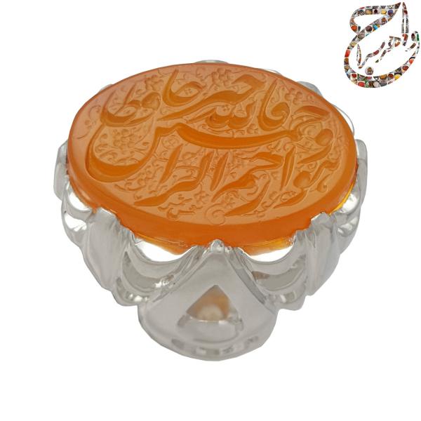 انگشتر عقیق یمنی پرتقالی تراش تخت حکاکی شده توسط استاد محمد مهدی شمس زنجانی با امضاء الفقیر شمس مزین به ذکر مبارک والله خیر حافظا فهو ارحم الراحمین . رکاب نقره یک تکه دست ساز به شیوه ی خاک ماسه توسط استاد امامی با مهر تهران امامی به وزن 18.8 گرم و سایز 63 با قابلیت تغییر سایز.