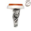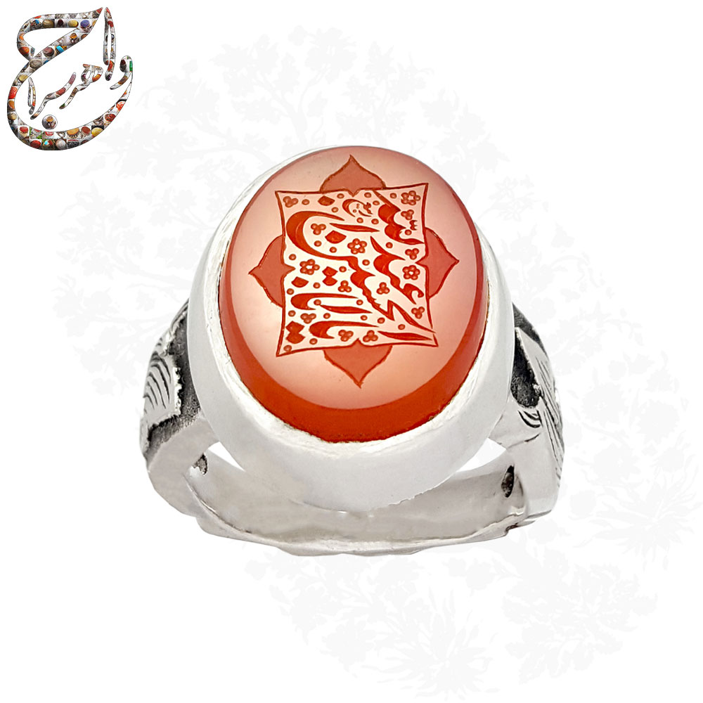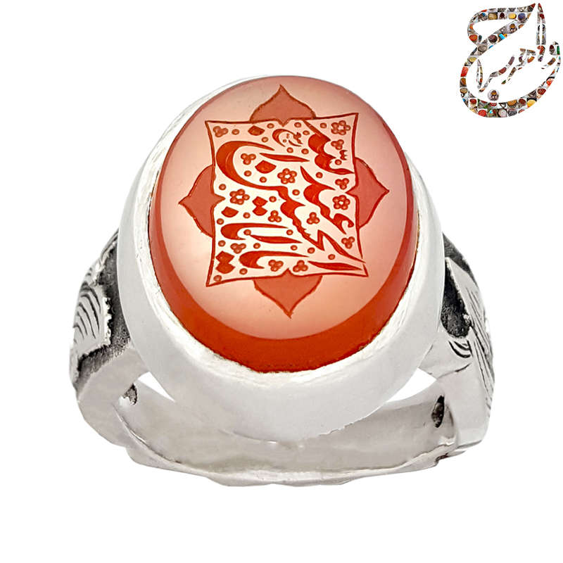 انگشتر عقیق سرخ تراش دامله حکاکی شده با امضاء ربیع مزین به ذکر مبارک یا اباعبدالله الحسین . رکاب نقره دو تکه دست ساز به شیوه ی خاک ماسه با مهر تهران سیدی به وزن 17.1 گرم و سایز 66 با قابلیت تغییر سایز و قلمزنی دستی استاد سهراب ساعی .
