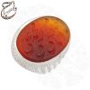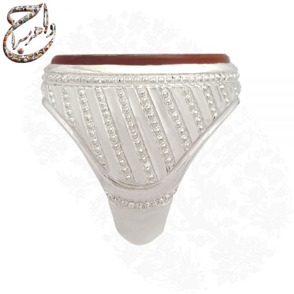 عقیق دو رنگ: نگین عقیق خراسانی با ترکیب دو رنگ سرخ و زرد، جلوهای طبیعی و زیبا به انگشتر بخشیده است.