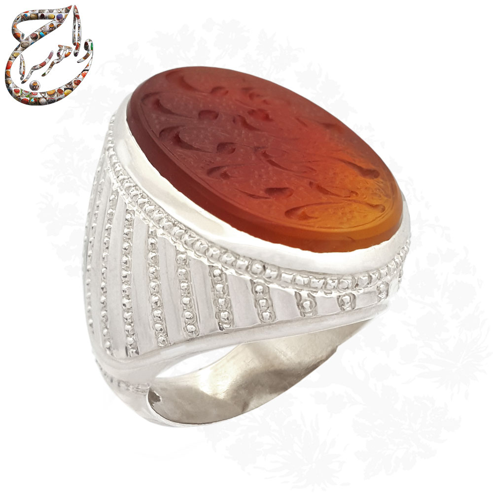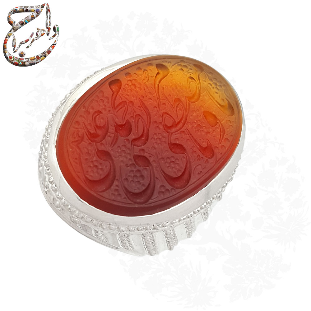 سنگ عقیق دو رنگ خراسانی با رنگهای سرخ و زرد که در این انگشتر به کار رفته است از جمله سنگهای پرطرفدار است که جلوهای زیبا به جواهرات میبخشد. تراش تخت این سنگ باعث وضوح بیشتر رنگ آن میگردد و سطح آن را برای اعمال حکاکی مناسب میسازد. دو رنگ بودن آن سبب شده تا علاوه بر حالتی طبیعی ظاهری منحصر به فرد نیز داشته باشد.