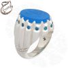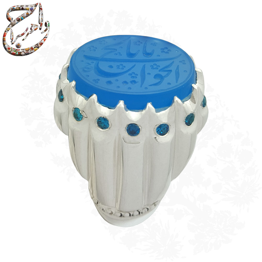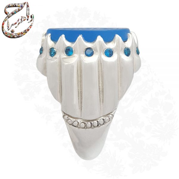 انگشتر عقیق سنتتیک آبی تراش تخت حکاکی شده با امضاء ضح مزین به ذکر مبارک یا باب الحوائج . رکاب نقره دو تکه دست ساز به شیوه ی خاک ماسه توسط استاد محمد افتخاری با مهر تهران افتخاری به وزن 25.2 گرم و سایز 63 با قابلیت تغییر سایز.