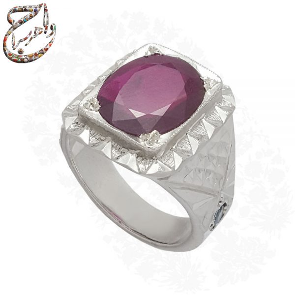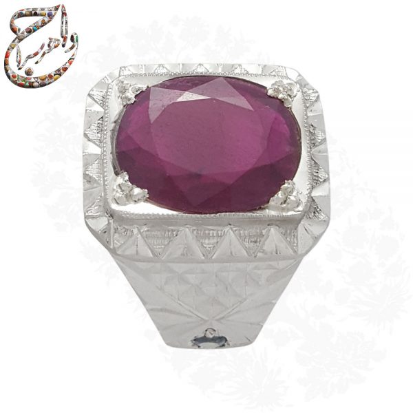 سنگ یاقوت سرخ آفریقایی با تراش جواهری در این انگشتر استفاده شده است. یاقوت از جمله سخت ترین سنگ ها با درجه سختی 9 است که سبب استحکام در برابر شکستگی و ایجاد خش میشود. این سنگ با رنگ زیبا و چشمنواز خود و شفافیت بالا بسیار باارزش و پرطرفدار بوده است که تراش جواهری آن، با ایجاد سطوح منظم و زوایای دقیق، این خواص و تلالو نور و درخشش آن را دو چندان کرده است.