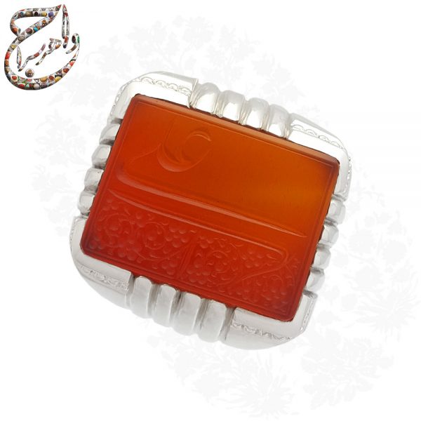 سنگ عقیق سرخ خراسانی اصیل در این انگشتر به کار گرفته شده است. عقیق سرخ به علت زیبایی ظاهری، رنگ جذاب و جایگاه معنوی در میان انواع سنگها، با ارزش و بسیار پرطرفدار بوده است. تراش تخت عقیق این انگشتر سبب ایجاد یک سطح مناسب برای پیاده سازی و نمایش حکاکی منقش برآن گردیده است.