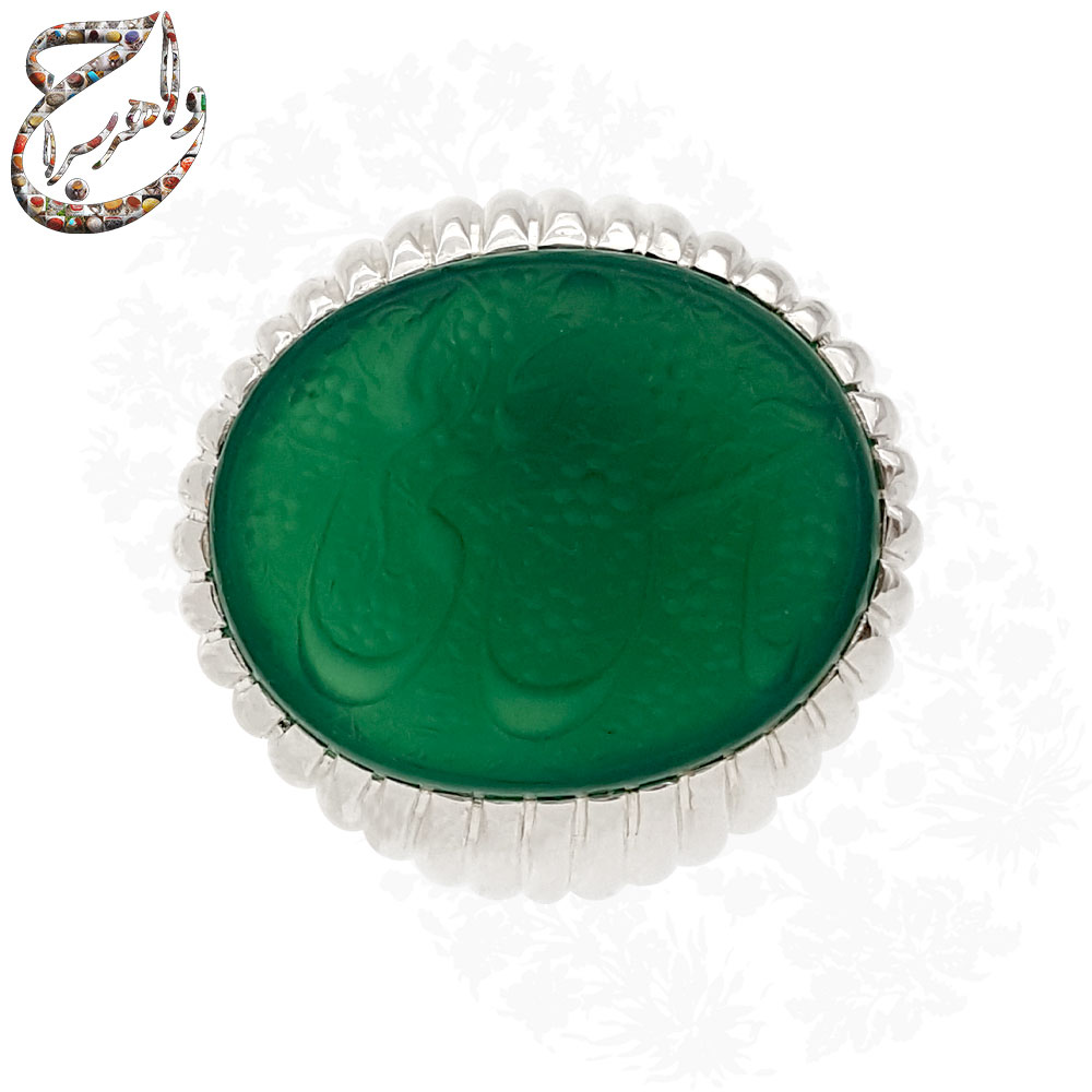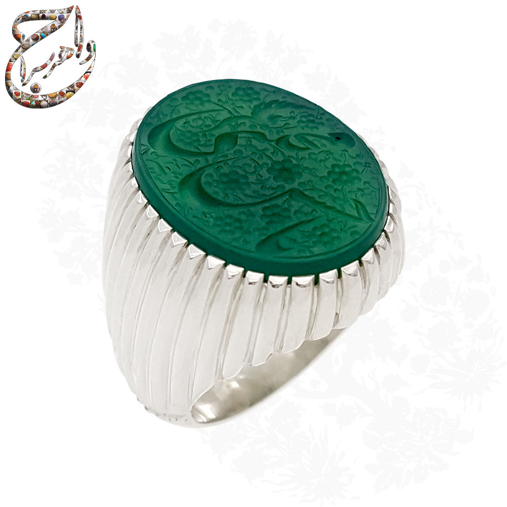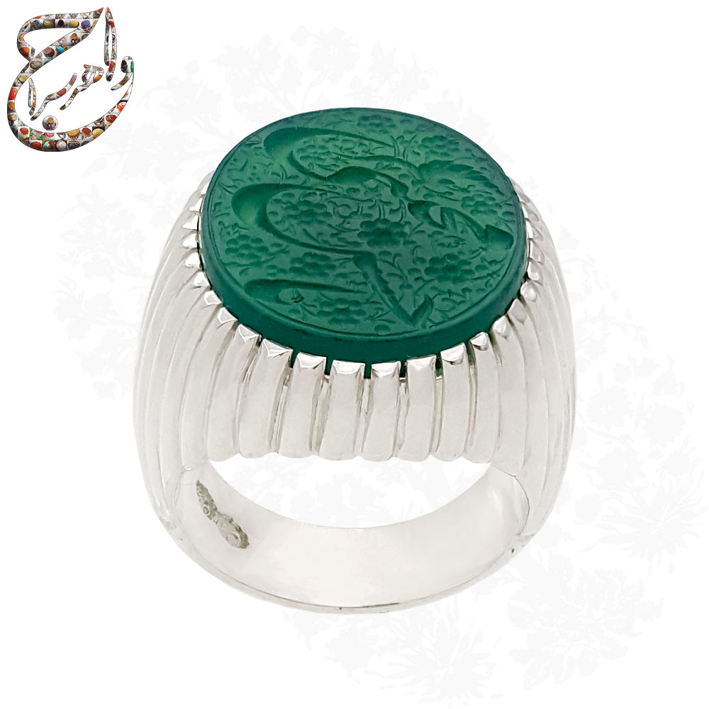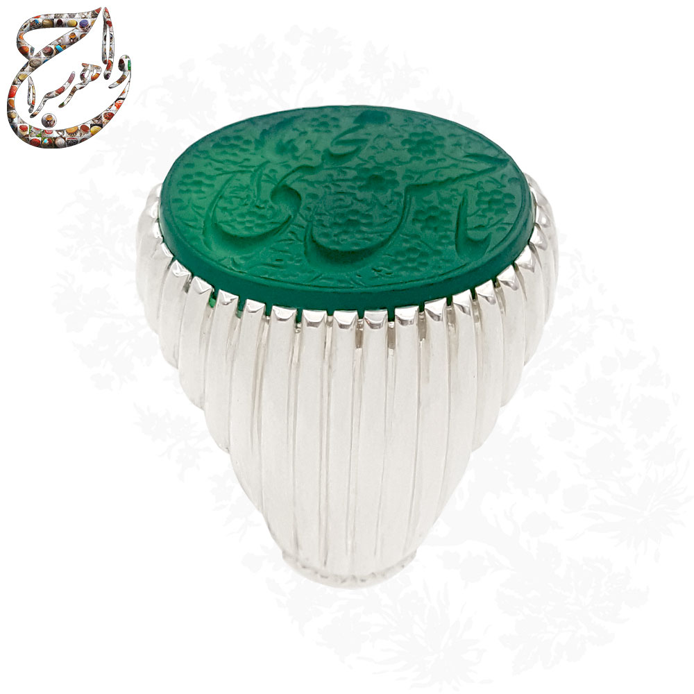 انگشتر عقیق سبز معدنی خطی با تراش تخت ، حکاکی شده توسط استاد ابراهیم اصغر پور با امضاء متین مزین به ذکر مبارک یا حسن مجتبی ع . رکاب نقره یک تکه دست ساز توسط استاد وحید امامی با مهر تهران امامی به وزن 18 گرم و سایز 64 با قابلیت تغییر سایز.