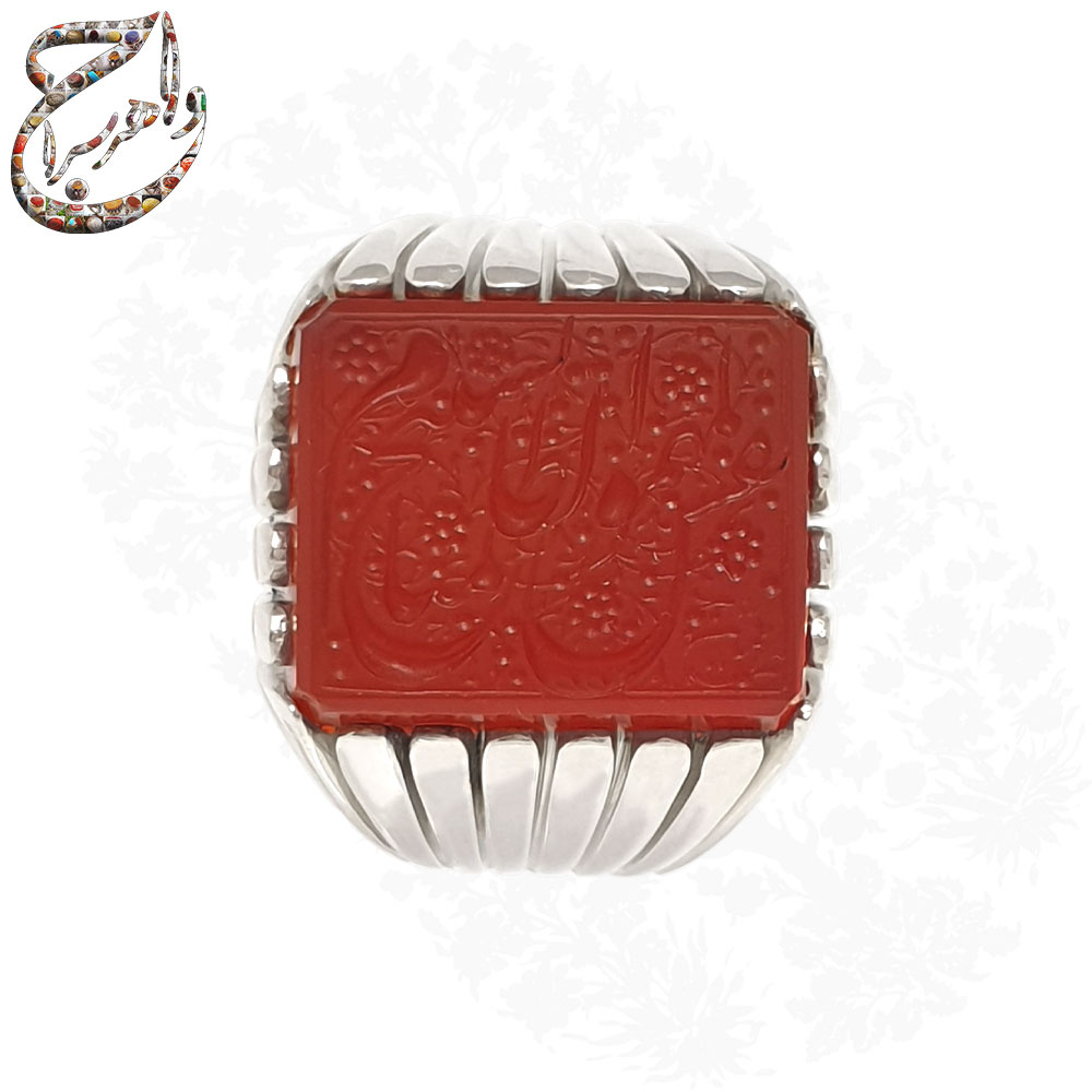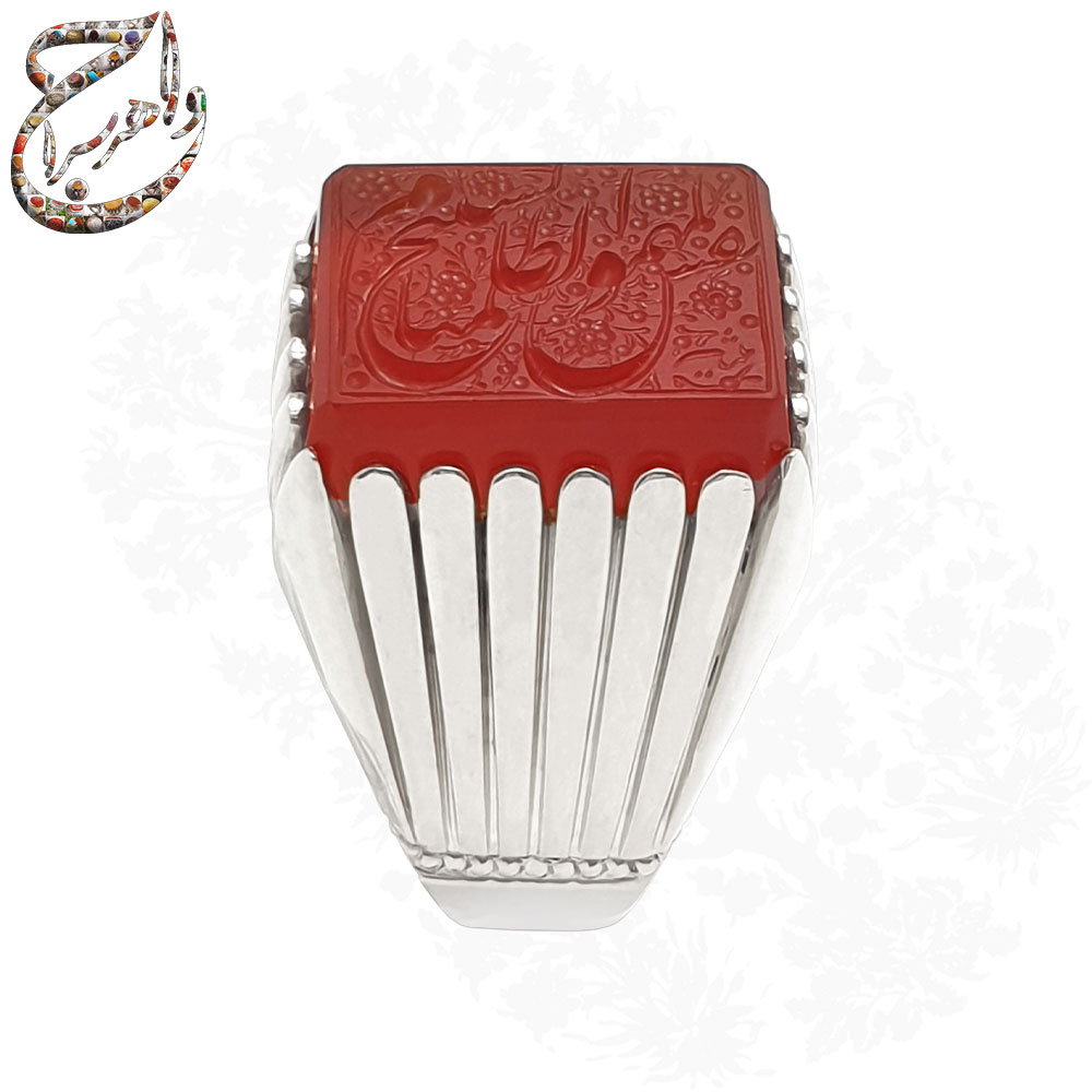 انگشتر عقیق سرخ خطی با تراش تخت و مربعی ، حکاکی شده توسط استاد ابراهیم اصغر پور با امضاء متین مزین به ذکر مبارک نفس المهموم لظلمنا تسبیح ( نفس های فرد غمگین از ظلمی که به ما اهل بیت روا داشته شده تسبیح است ) . رکاب نقره ذو تکه دست ساز ، ساخته شده توسط استاد امیر لطفی با مهر تهران لطفی به وزن 18 گرم و سایز 64 با قابلیت تغییر سایز.