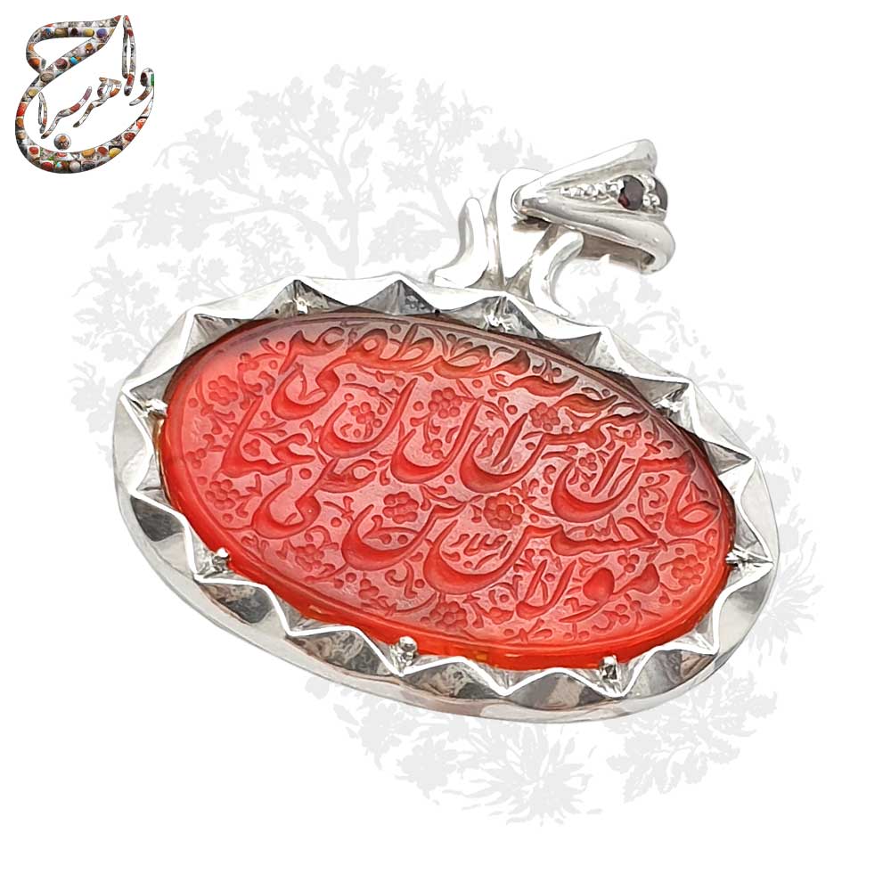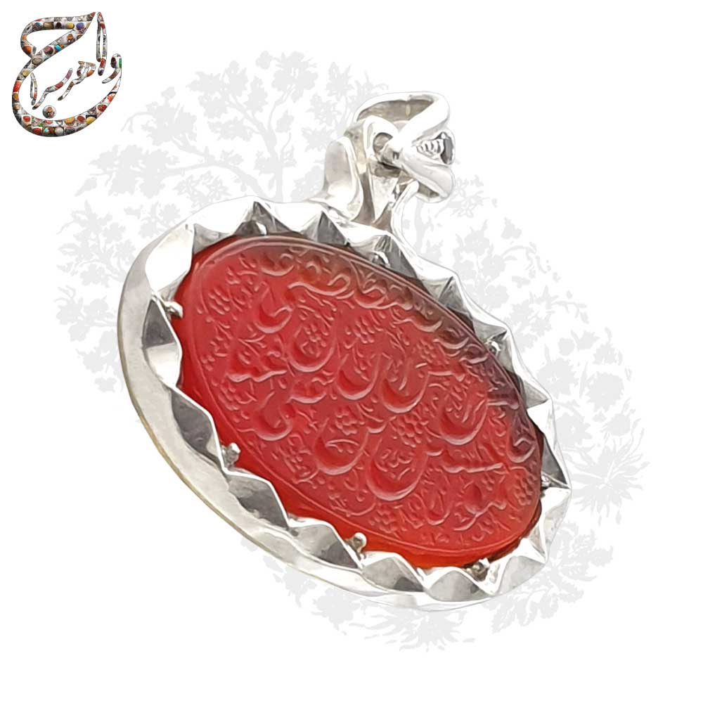 گردن آویز عقیق سرخ معدنی با تراش تخت ، حکاکی شده توسط با امضاء اعلاء مزین به ذکر مبارک خامس آل عبا ، شمس آل مصطفی ، مولا حسین ابن علی (ع) ، قاب دست ساز با مهر تهران فتوحی و قلمزنی دستی بر روی ورق برنجی پشت قاب