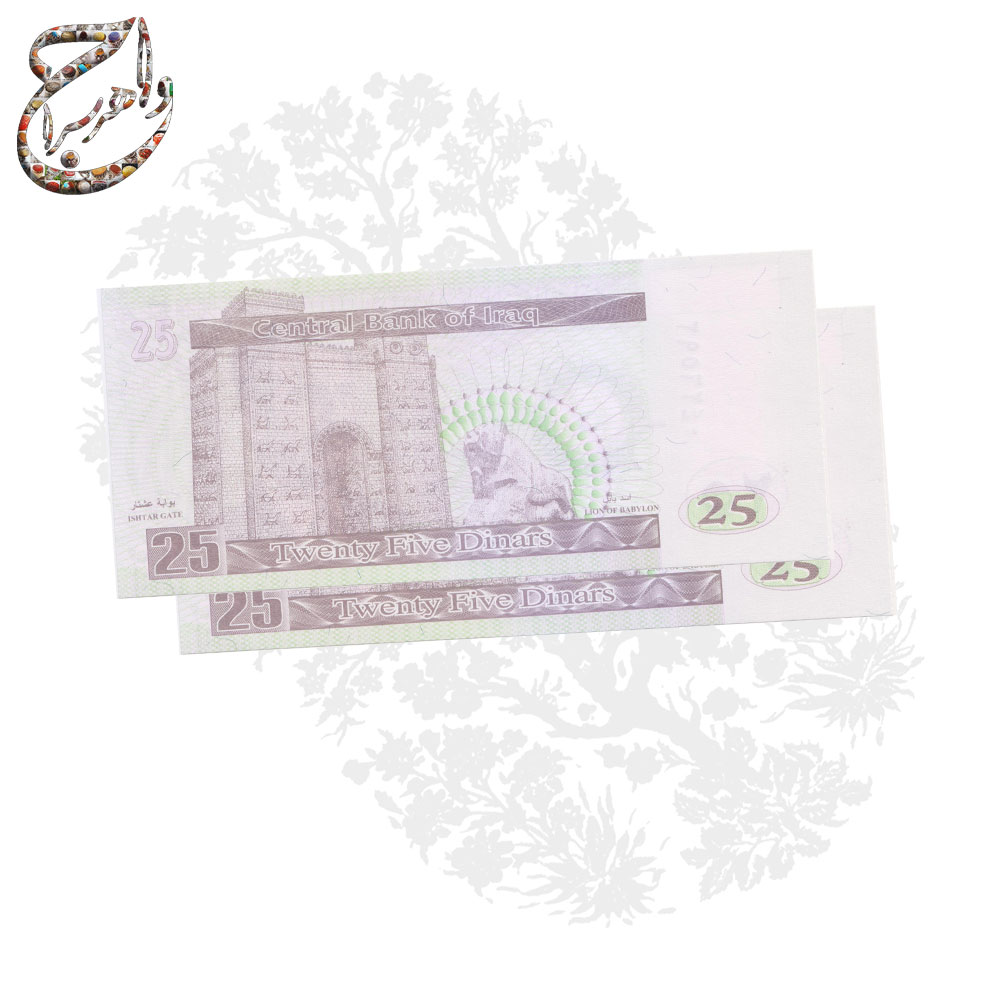 اسکناس 25 دیناری عراق با تصویر صدام حسین و طراحی معماری باستانی این کشور، از دوران حکومت صدام یادگاری ارزشمند است. این جفت اسکناس دارای شماره سریال پشت سر هم است. طراحی امنیتی و جزئیات دقیق در این اسکناس، جذابیتی ویژه برای کلکسیونداران دارد. کیفیت اسکناسها فوقالعاده و مناسب مجموعههای تاریخی است.