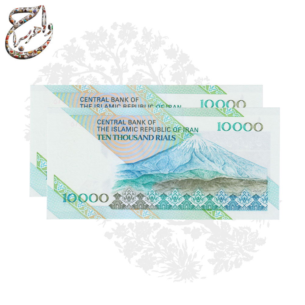 جفت اسکناس ده هزار ریالی ایران، که با نام “هزاری سبز” نیز شناخته میشود، از جمله اسکناسهای رسمی بانک مرکزی جمهوری اسلامی ایران است. این اسکناسها با کیفیت سوپر بانکی ارائه شده و طراحی مدرن و زیبایی دارند. در یک سمت تصویر بنیانگذار انقلاب اسلامی، امام خمینی (ره)، و در سمت دیگر تصویری از قله دماوند، نماد طبیعت ایران، به نمایش درآمده است.
