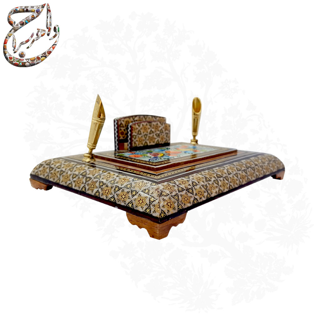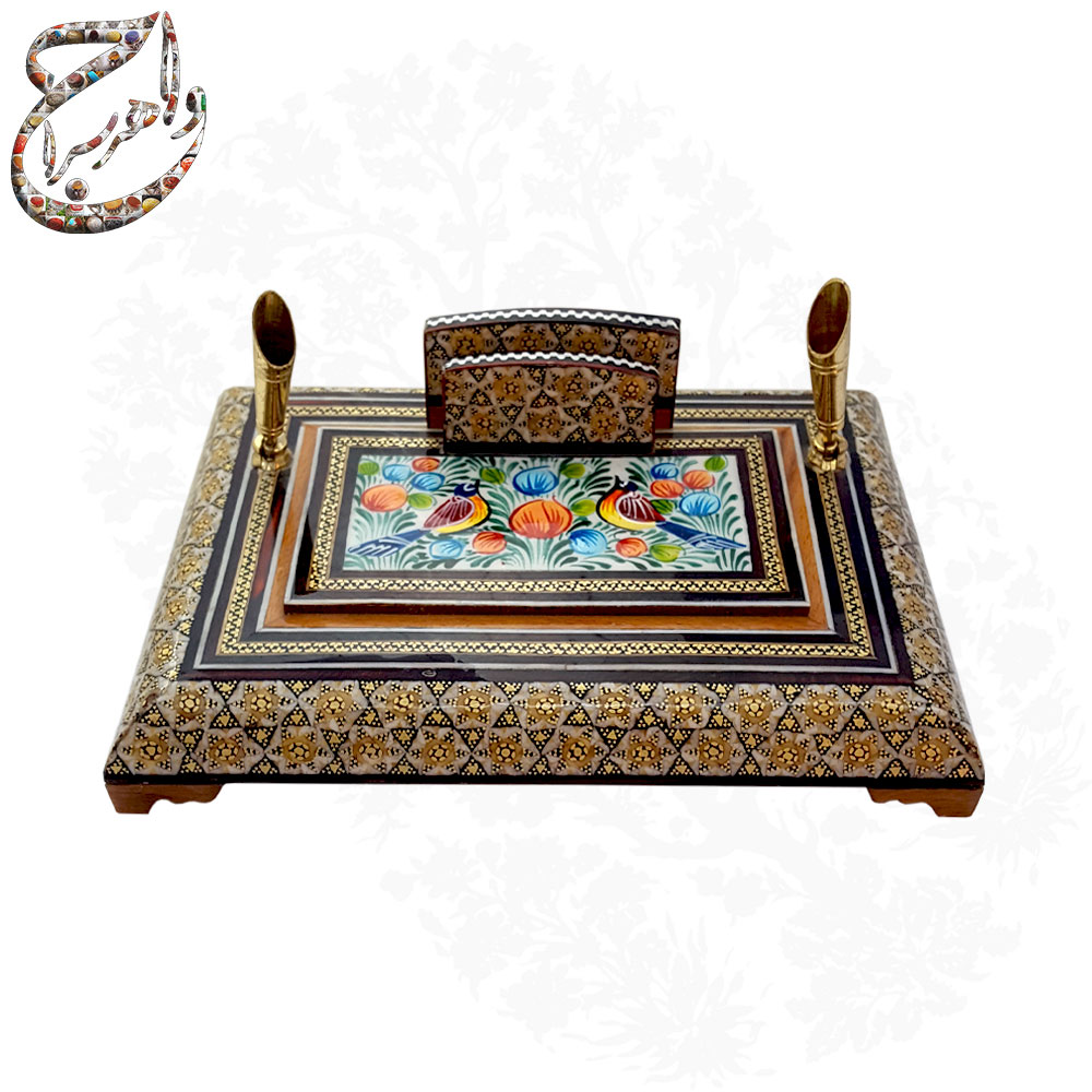 قلمدان خاتم کاری شده با نقاشی دستی طرح گل و مرغ . دارای دو عدد جای قلم و جای کارت . ساخته شده از خاتم کاری و رزین بر پایه ی چوب . موجود در فروشگاه جواهرسرا